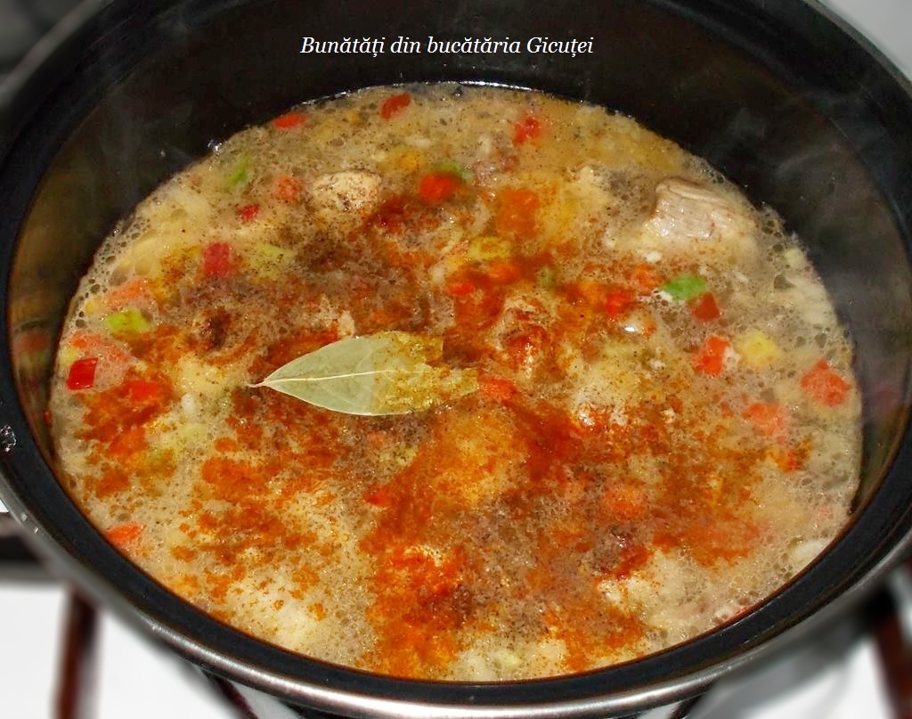 Turnam ulei intr-o cratita si asezam cratita pe foc potrivit. Cand uleiul se incinge punem bucatile de carne si le rumenim pe toate partile. Cat timp carnea se rumeneste curatam ceapa si ardeiul, le spalam si le tocam in cubulete. Peste carnea rumenita adaugam ceapa si un praf bun de sare. O lasam 1-2 minute sau pana se inmoaie putin , apoi punem si ardeiul. Amestecam si turnam supa(apa) cat sa depaseasca legumele si carnea cu doua degete. Condimentam cu boia si piper macinat, apoi adaugam frunza de dafin. Acoperim partial cratita cu capac si lasam sa fiarba la foc mic. Daca zeama scade prea mult mai completam cu supa sau apa fiebinte. Intre timp putem pregati compozitia pentru galuste: spargem oul intr-un castron si presaram putina sare peste el. Il batem bine cu furculita sau cu un tel in forma de para, apoi adaugam in ploaie si in mai multe reprize grisul. Amestecam bine de fiecare data. Lasam compozitia deoparte 10- 15 minute ca sa se umfle grisul. Cand carnea este bine patrunsa adaugam pasta de tomate si punem sare dupa gust.