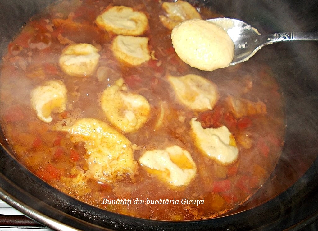 „Taiem” cu lingurita din compozitia de galuste si  punem la fiert direct in sos. Dupa 3-4 minute intoarcem usor cu o lingura fiecare galusca. Cand sunt fierte, ingrosam sosul cu o lingura rasa de faina diluata in putina apa. Mai lasam sa dea 2-3 clocote, oprim focul de sub cratita si presaram deasupra mancarii patrunjel verde tocat. Bunatate!