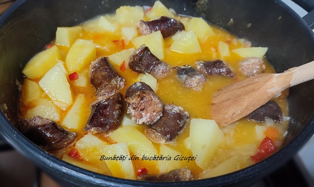 Cand se prajesc carnatii pe toate partile ii scoatem din cratita si adaugam ceapa si un praf de sare. O lasam cat sa se inmoaie, apoi punem ardeiul. Eu am folosit ardei congelat, dar se poate folosi ardei proaspat. Dupa 1-2 minute adaugam cartofii scursi de apa, amestecam si mai lasam 2-3 minute sa se inabuse. Dupa acest timp turnam apa pana la nivelul legumelor, apoi acoperim cratita partial cu un capac si lasam mancarea sa fiarba la foc mic. Amestecam din cand in cand in mancare, iar daca este nevoie mai putem adauga putina apa fierbinte. Cand cartofii sunt aproape patrunsi punem carnatii prajiti si pasta de tomate. Condimentam mancarea cu boia, piper macinat, si potrivim gustul de sare. Mai lasam mancarea sa fiarba 5-7 minute, apoi inchidem focul de sub cratita si presaram deasupra patrunjelul tocat. Servim mancarea, fierbinte, alaturi de muraturi sau salata preferata. Simplu si gustos!