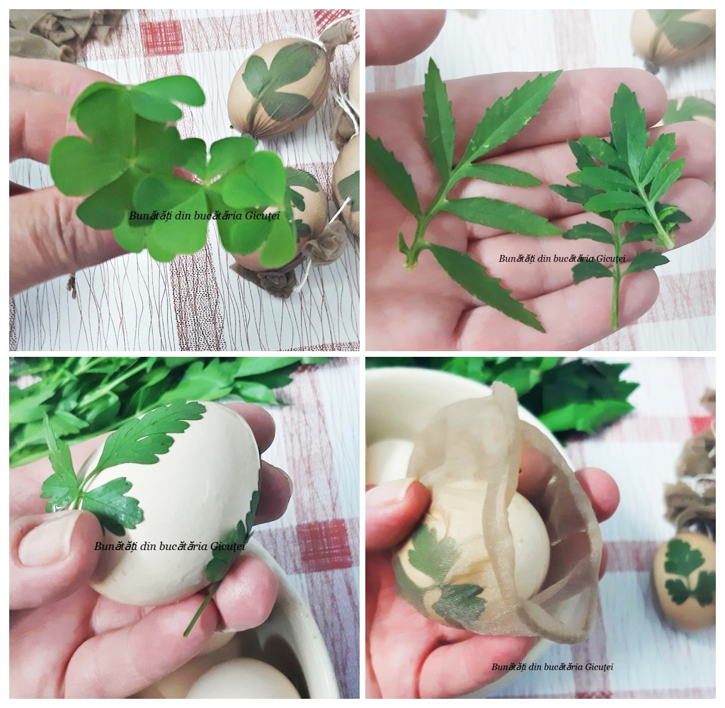 Rupem frunzulitele, le umezim in apa si le asezam/lipim pe coaja oului cu partea care are nervuri. Eu am pus cate doua, daca doriti puteti lipi o singura frunzulita. Tinem oul in asa fel incat sa cuprindem si frunzulitele si tragem cu atentie bucata de dres peste el. Intindem dresul cat de bine putem avand grija sa nu spargem oul, apoi il rasucim si il legam cu sfoara. Procedam la fel pana terminam de decorat toate ouale.
