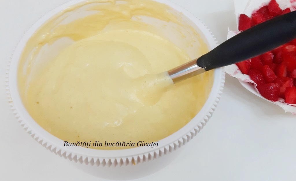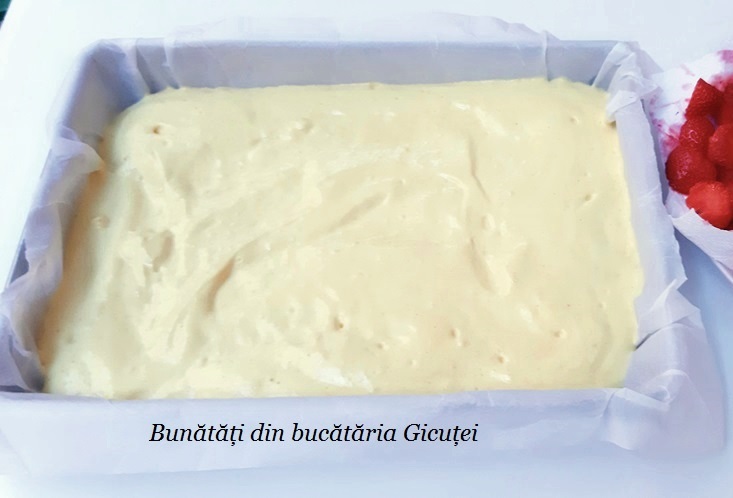Lasam mixerul deoparte si cernem faina deasupra compozitiei de oua. Cu ajutorul unei spatule de bucatarie amestecam usor, de jos in sus, ca sa incorporam faina. Turnam compozitia in tava pregatita dinainte, o nivelam si trantim usor tava de masa ca sa se aseze aluatul cat mai bine. Punem deasupra bucatile de capsuni. Dam tava la cuptor pentru aproximativ 35-40 de minute sau pana prajitura se rumeneste frumos deasupra. Ca sa fim siguri ca prajitura este coapa putem sa facem proba cu scobitoarea: dupa primele 35 de minute infigem o scobitoare in mijlocul prajiturii, iar daca iese curata, fara aluat prins de ea inseamna ca prajitura este coapta. Daca pe scobitoare raman urme de aluat mai lasam prajitura in cuptor si repetam proba cu scobitoarea dupa cinci minute. Cand este gata, scoatem tava din cuptor, lasam prajitura sa se racoreasca 7-8 minute, apoi o scoatem din tava cu hartie cu tot. Cand se raceste o portionam, o asezam pe un platou, apoi o putem servi. Optional se poate pudra cu zahar. Deliciu!!