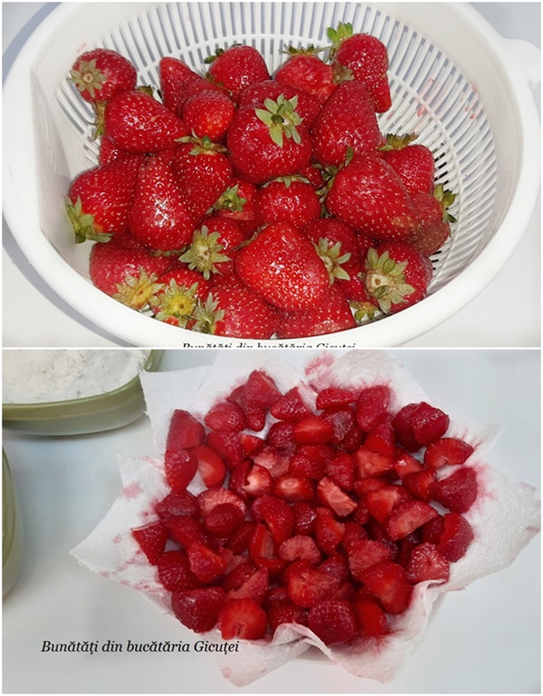 Pentru inceput spalam capsunile si le lasam la scurs intr-o strecuratoare. Capsunile se pot inlocui cu orice fructe de sezon. Cand sunt bine scurse, indepartam coditele si taiem capsunile in bucati potrivit de mari. Bucatile nu trebuie sa fie egale. Punem capsunile taiate pe prosop de hartie ca sa absoarba sucul lasat. Aprindem cuptorul la foc potrivit(180°C). Tapetam o tava(25x 35cm) cu hartie de copt. Eu am udat tava inainte ca sa pot aseza hartia cat mai bine in ea.