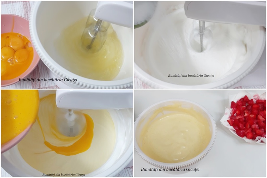 Masuram/ cantarim zaharul si faina. Spargem ouale separand albusurile de galbenusuri. Albusurile le punem in vasul mixerului sau in alt vas impreuna cu sarea. Mixam albusurile cateva minute(3-4) pana devin spuma, apoi adaugam in doua reprize zaharul si zaharul vanilat si mixam de fiecare data pana acesta se dizolva complet. Trebuie sa ne iasa o bezea tare si lucioasa. Cu mixerul la viteza mica incorporam treptat galbenusurile batute in prealabil cu furculita. Aromatizam cu coaja de lamaie si mai mixam cateva secunde.