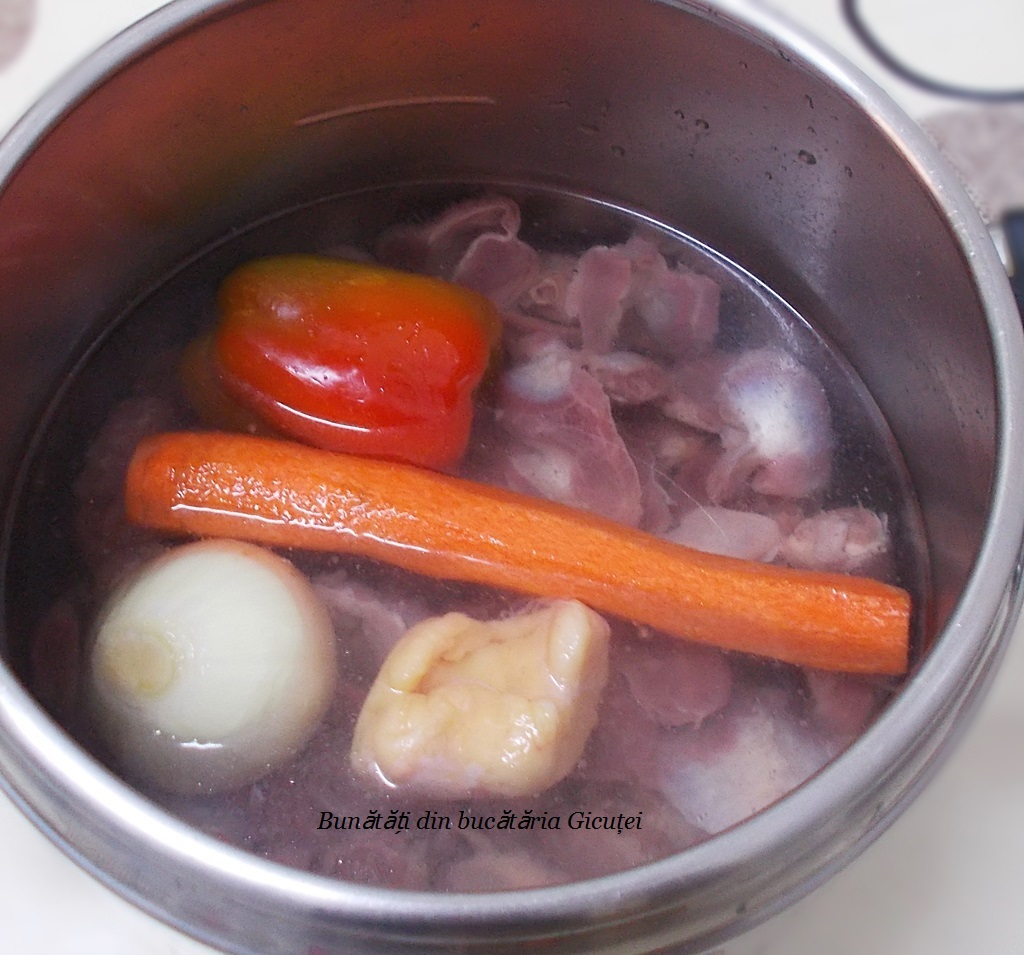 Curățăm și spălăm în mai multe ape inimile și pipotele, apoi le punem la fiert într-o oală cu apă cât să le acopere cu o palmă. Eu le-am fiert în oala sub presiune și am adăugat de la început un praf bun de sare, ceapa, ardeiul și un morcov întreg. Am mai pus și puțină grăsime de pasăre de curte.