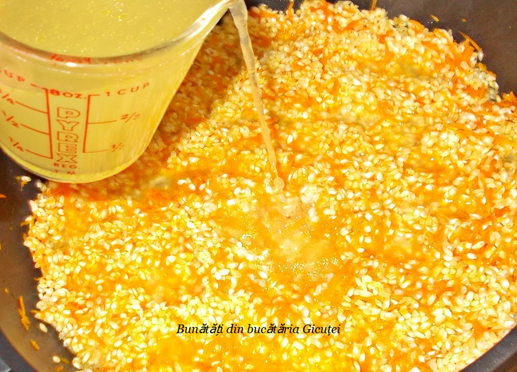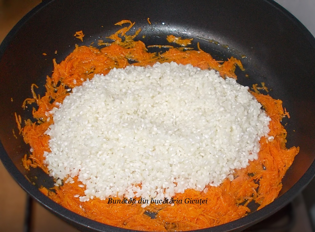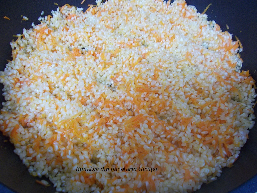 Morcovul rămas îl dăm pe răzătoarea mică și îl călim 1-2 minute în uleiul încins. Adăugăm orezul spălat, îl călim 1-2 minute împreună cu morcovul, apoi punem 3 căni și jumătate din supa în care au fiert inimile și pipotele.