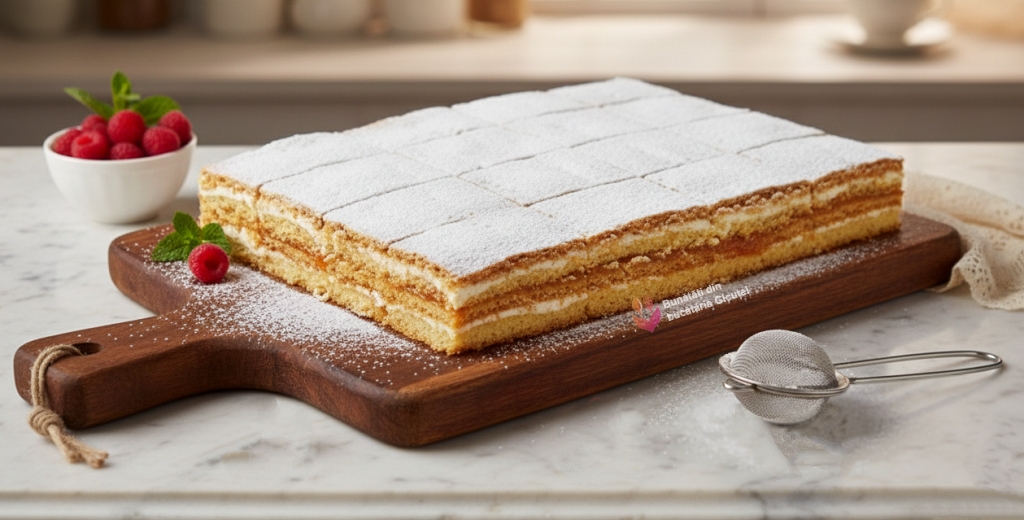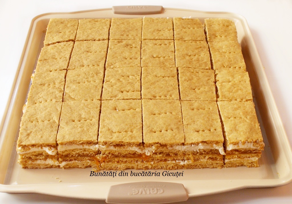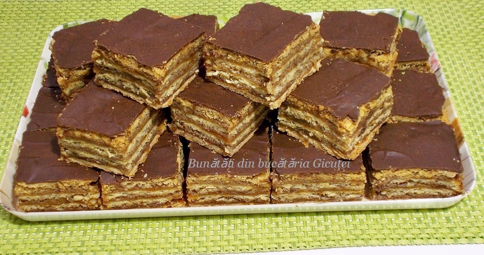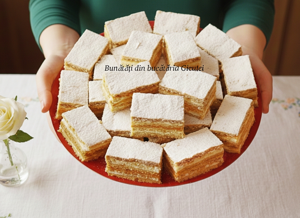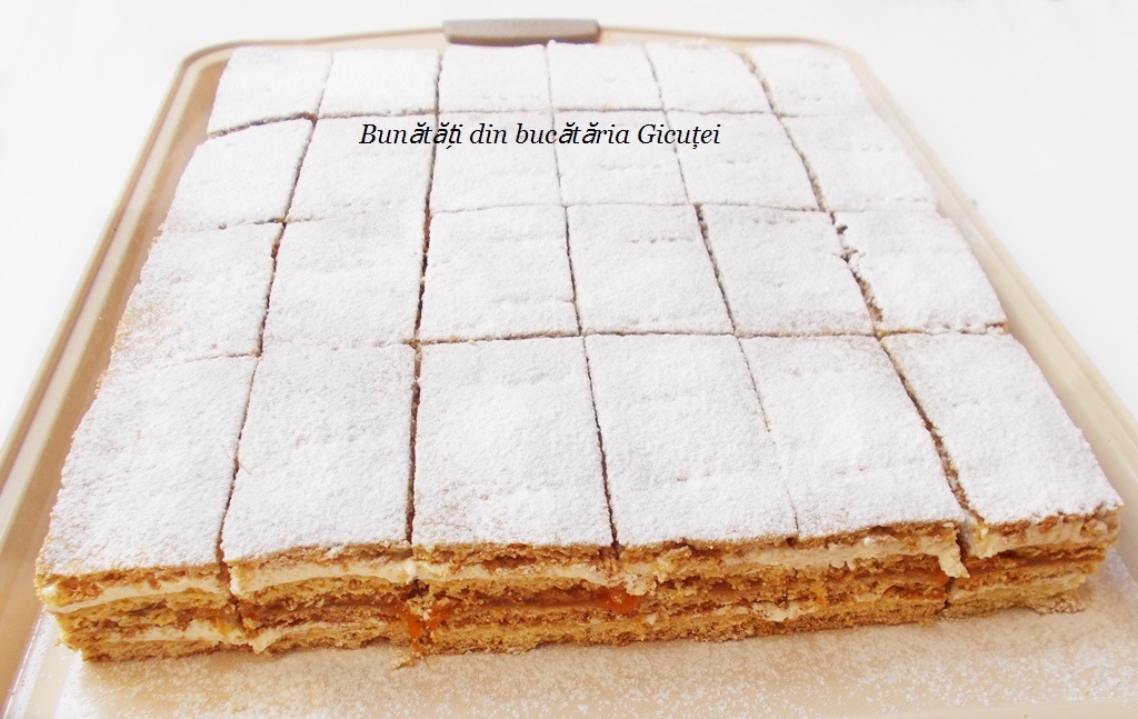 A doua zi indreptam marginile prajiturii cu un cutit si o taiem in dreptunghiuri pe care le pudram cu zahar pudra. Este un deliciu.