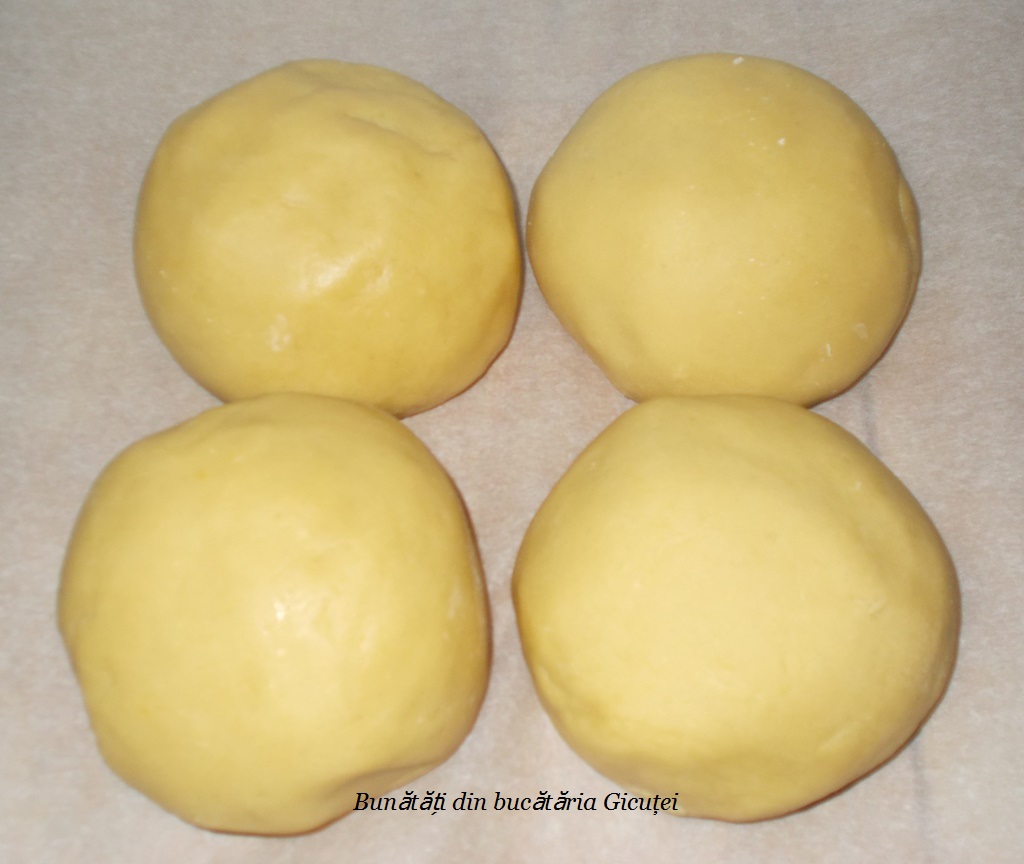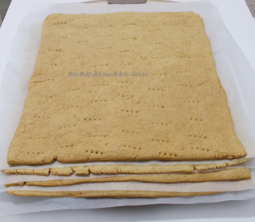 Impartim aluatul in patru parti egale. Vom intinde patru foi pe care le coacem pe dosul tavii mari de aragaz. Eu am intins aluatul direct pe hartie de copt, l-am intepat din loc in loc cu furculita si i-am decupat marginile. L-am transferat cu totul pe fundul tavii. Am copt fiecare foaie 7-8 minute la foc potrivit in cuptorul preincalzit la foc mediu.