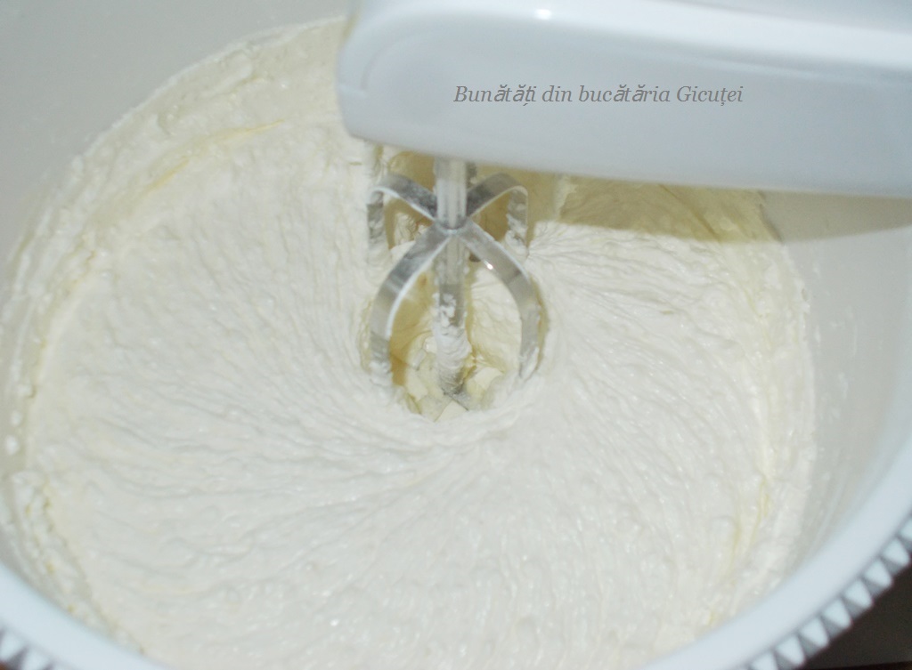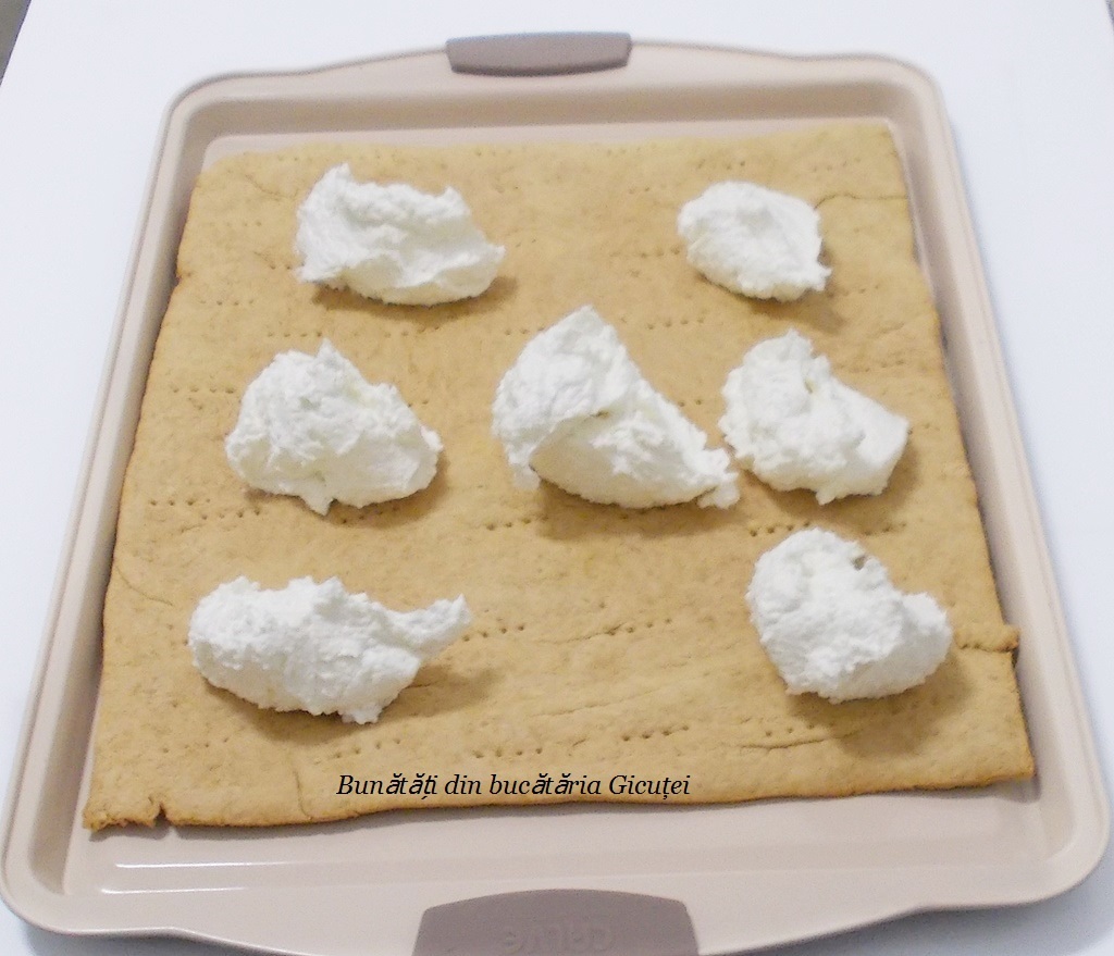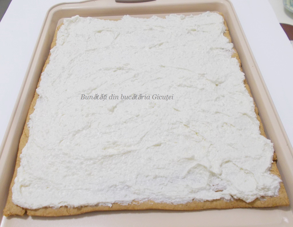 A doua zi indreptam marginile prajiturii cu un cutit si o taiem in dreptunghiuri pe care le pudram cu zahar pudra. Este un deliciu.