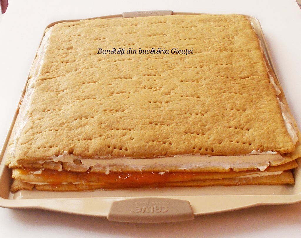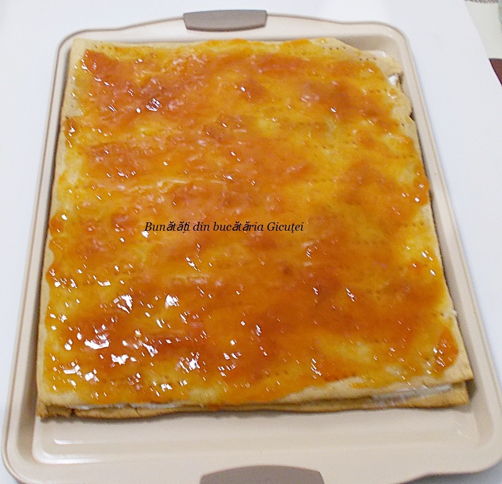 Asezam prima foaie pe o tava(platou) si intindem peste ea jumatate din crema. Acoperim crema cu a doua foaie, apasam usor cu palmele si intindem peste ea gemul. Urmeaza a treia foaie, apoi restul de crema si acoperim cu a patra foaie. Invelim parajitura cu folie alimentara si punem o greutate ( am pus un tocator) peste ea ca sa stea presata. O lasam la loc racoros peste noapte ca sa se fragezeasca foile.
