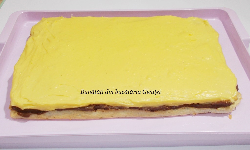 Punem aluatul in tava pregatita dinainte si il intindem uniform. Dam tava la cuptor pentru aproximativ 15-20 de minute sau pana blatul se rumeneste usor deasupra. Cand este gata, scoatem blatul din tava cu hartie cu tot si cand se racoreste putin il stropim cu 3-4 linguri de lapte caldut.