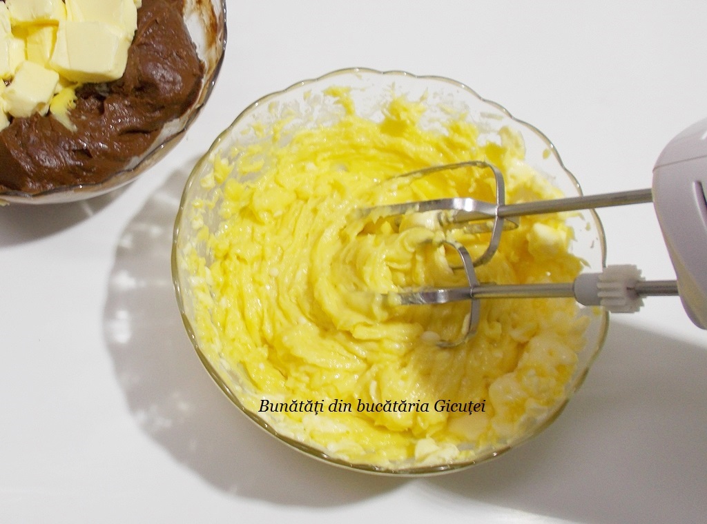 Intr-o craticioara punem galbenusurile, zaharul si sarea. Le amestecam cu telul in forma de para, apoi adaugam faina lingura cu lingura si amestecam pana la omogenizare. Turnam laptele treptat si amestcam bine ca sa nu fie cocoloase. Punem craticioare pe foc mic sau pe baie de aburi si fierbem pana crema se ingroasa. In aproximativ 6-7 minute dupa ce incepe sa fiarba art trebui sa fie gata… trebuie sa aiba consistenta unei smantani mai groasa. Cat timp fierbe amestecam continuu. Cand este gata, dam craticioara deoparte, adaugam esenta si amestecam. Impartim crema in doua parti egale(o vom pune in doua boluri). Intr-unul din boluri adaugam ciocolata rupta bucatele si amestecam bine pana aceasta se topeste. Lasam cremele sa se raceasca, apoi in bolul cu ciocolata adaugam 100 g unt taiat cubulete. In celalat bol punem restul de unt (150 g). Mixam bine fiecare crema pana la omogenizare.