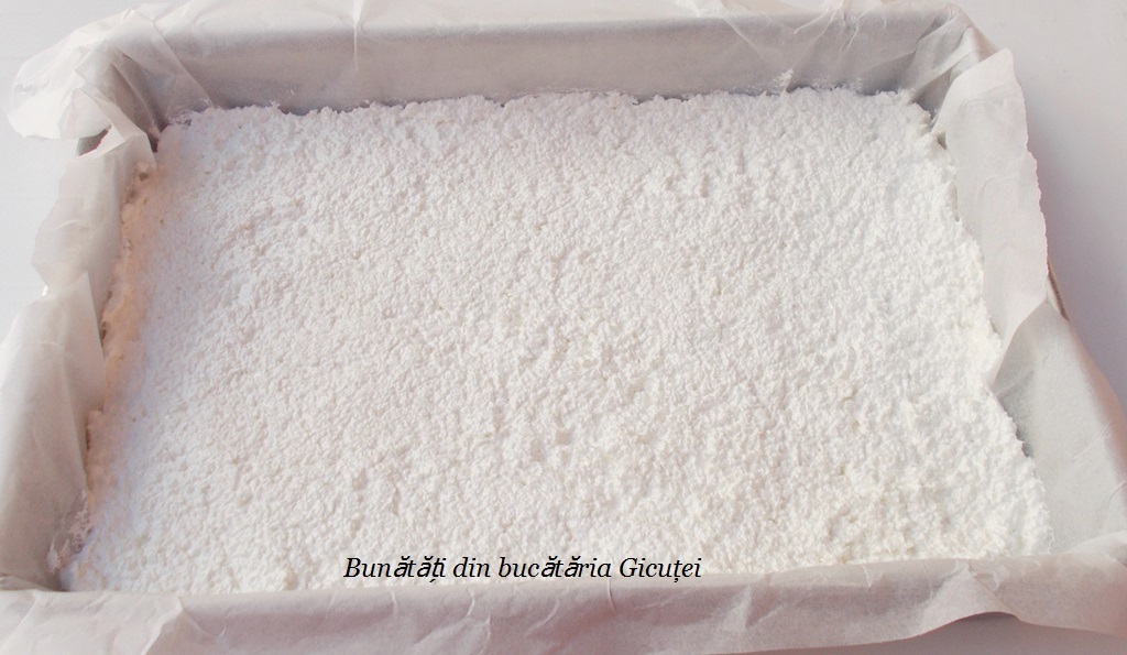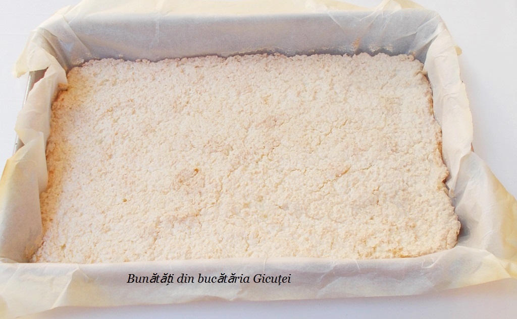 Aprindem cuptorul la foc mediu(170-180ºC), apoi asternem hartie de copt intr-o tava(25x35cm). Eu am udat tava inainte, ca hartia sa se lipeasca mai bine de ea.