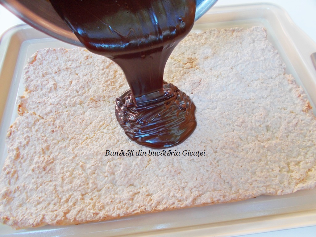Trecem usor cu lama unui cutit pe sub blat ca sa desprindem hartia de el, apoi il asezam cu grija pe un platou. Turnam deasupra blatului ciocolata topita(calda), nivelam si dam tava cu blatul la frigider pentru 15-20 de minute sau pana ciocolata se intareste.