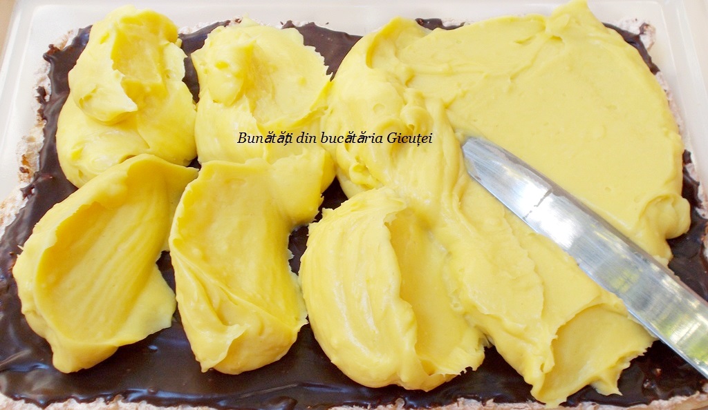 Dupa acest timp repartizam crema de vanilie peste stratul de ciocolata si nivelam. Deasupra cremei radem cele 50 g de ciocolata, apoi dam tava cu prajitura la frigider. Trebuie sa stea cateva ore, de preferat peste noapte, apoi o putem portiona. Nu pot sa spun decat ca este un deliciu….o sa va convingeti