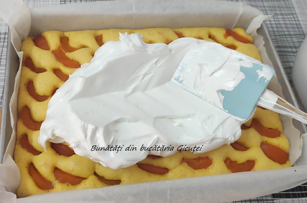 Scoatem tava cu prajitura din cuptor, intindem bezeaua deasupra fructelor, apoi cu o furculita trasam linii serpuite.