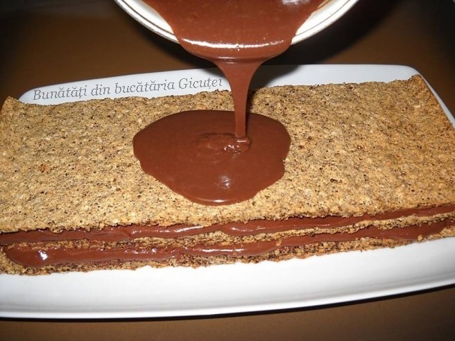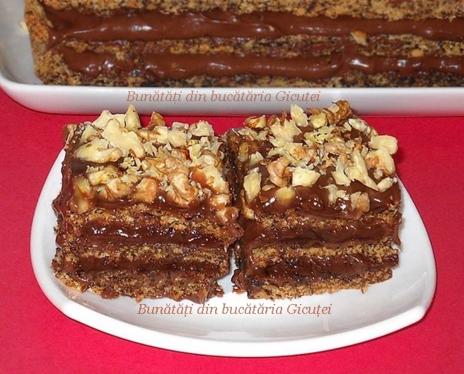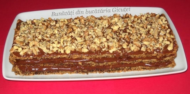 Tăiem blatul, pe verticală, în trei bucăți egale. Pe un platou așezăm prima bucată de blat și întindem jumătate din cantitatea de cremă (călduță). Așezăm al doilea blat și întindem restul de cremă. Peste al treilea blat vom turna glazura de ciocolată. Decorăm cu nuci prăjite/uscate și tocate grosier. Dăm prăjitura la frigider și o tăiem a doua zi (eu nu am avut răbdare și am tăiat-o după 2 ore). Un deliciu!
