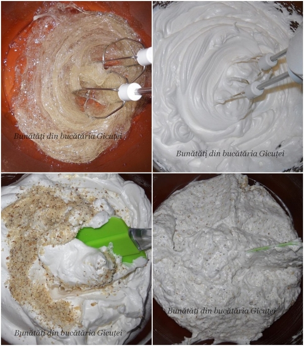 Peste albușuri punem puțină sare și le mixăm până devin spumă. Adăugăm zahărul în 2-3 reprize și mixăm bine de fiecare dată până zahărul se dizolvă complet. La final trebuie să obținem o bezea tare și lucioasă. Amestecăm nucile cu făina, praful de copt (dacă îl folosiți) și le incorporăm în bezea amestecând ușor cu o spatulă, de jos în sus. Tapetăm o tavă mare (am folosit tava de la aragaz) cu hârtie de copt și întindem bezeaua. Punem tava în cuptorul preîncălzit la foc mediu (180°C) pentru aproximativ 25 de minute sau până bezeaua se întărește și începe să se rumenească ușor pe margini. Când este gata, scoatem tava cu blatul din cuptor și îl lăsăm să se răcească.