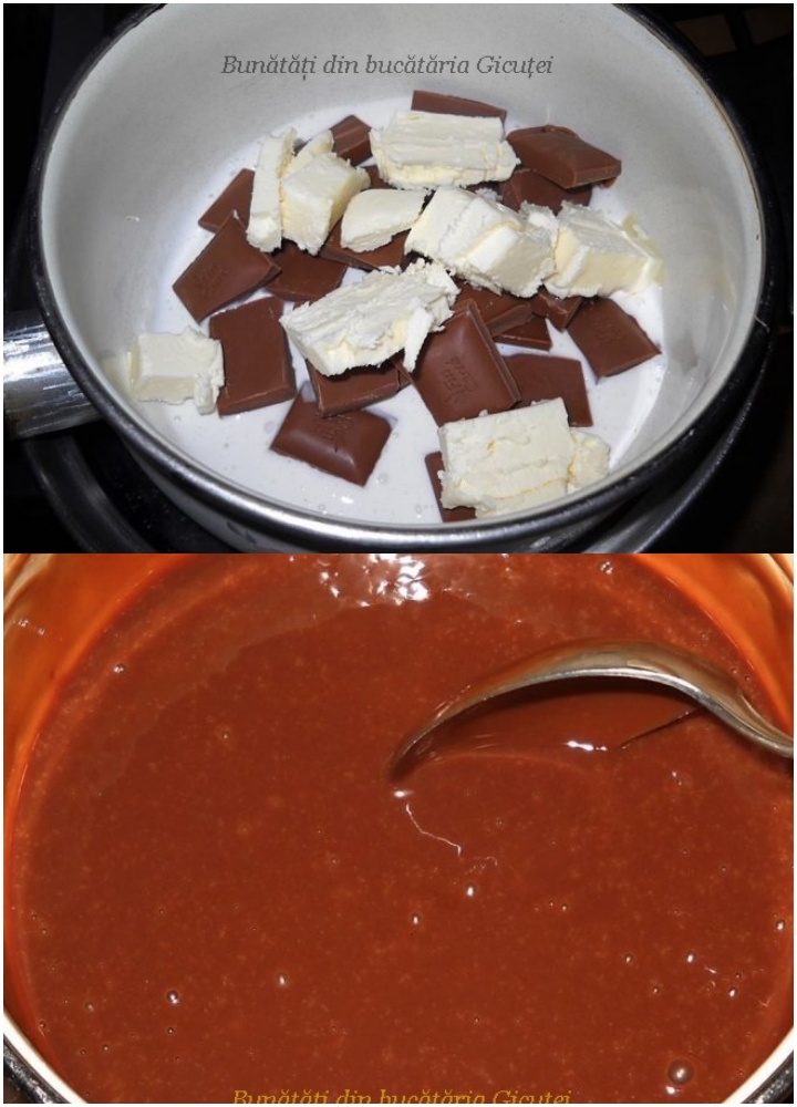 Punem la topit pe baie de aburi ciocolata ruptă bucățele împreună cu frișca și untul. Amestecăm până la omogenizare.
