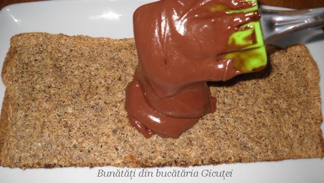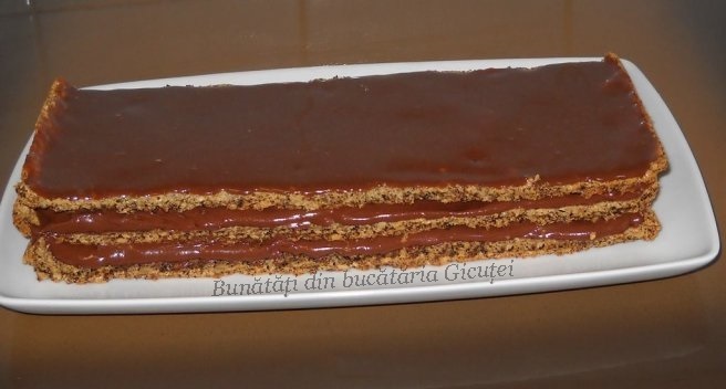 Tăiem blatul, pe verticală, în trei bucăți egale. Pe un platou așezăm prima bucată de blat și întindem jumătate din cantitatea de cremă (călduță). Așezăm al doilea blat și întindem restul de cremă. Peste al treilea blat vom turna glazura de ciocolată. Decorăm cu nuci prăjite/uscate și tocate grosier. Dăm prăjitura la frigider și o tăiem a doua zi (eu nu am avut răbdare și am tăiat-o după 2 ore). Un deliciu!