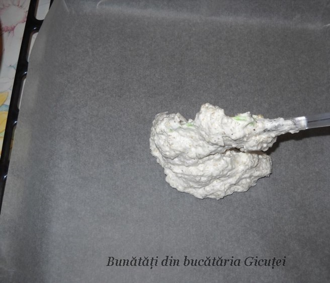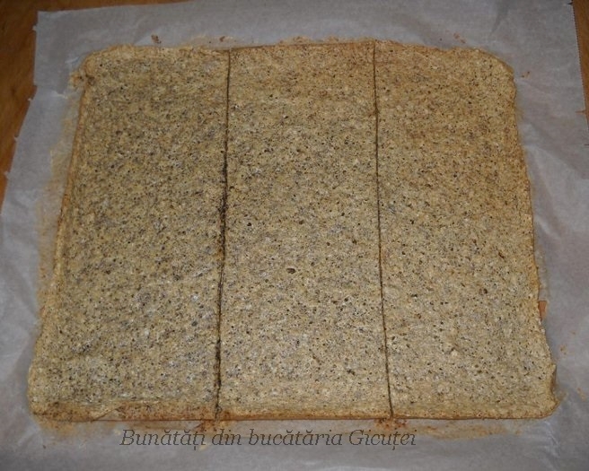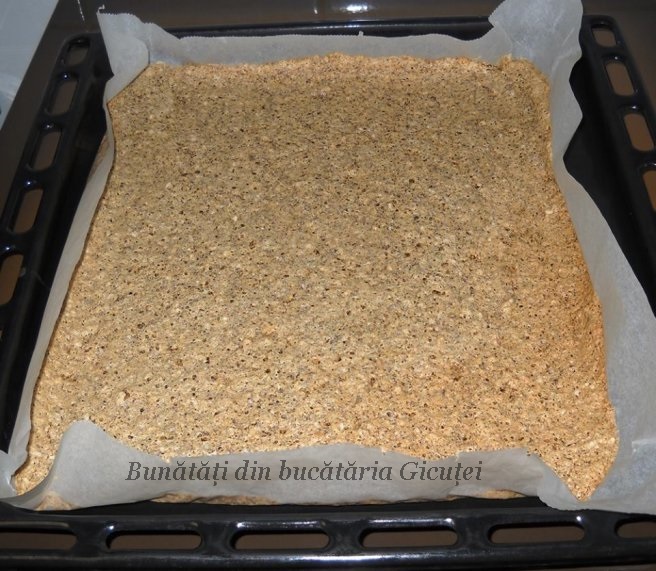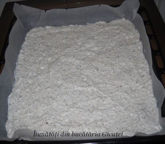 Peste albușuri punem puțină sare și le mixăm până devin spumă. Adăugăm zahărul în 2-3 reprize și mixăm bine de fiecare dată până zahărul se dizolvă complet. La final trebuie să obținem o bezea tare și lucioasă. Amestecăm nucile cu făina, praful de copt (dacă îl folosiți) și le incorporăm în bezea amestecând ușor cu o spatulă, de jos în sus. Tapetăm o tavă mare (am folosit tava de la aragaz) cu hârtie de copt și întindem bezeaua. Punem tava în cuptorul preîncălzit la foc mediu (180°C) pentru aproximativ 25 de minute sau până bezeaua se întărește și începe să se rumenească ușor pe margini. Când este gata, scoatem tava cu blatul din cuptor și îl lăsăm să se răcească.
