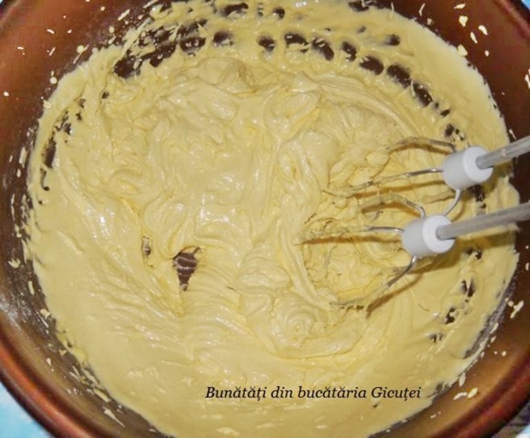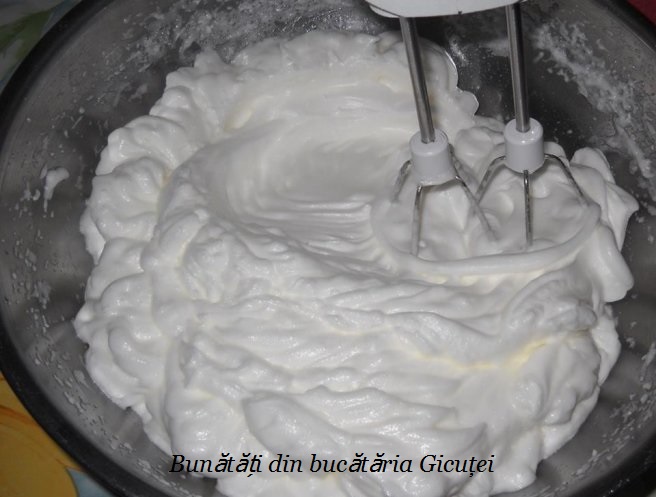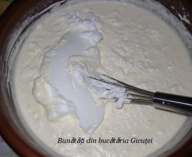 Peste albusuri punem putina sare si le mixam pana devin o spuma tare, apoi le incorporam treptat in compozitia de galbenusuri amestecand usor cu un tel in forma de para.