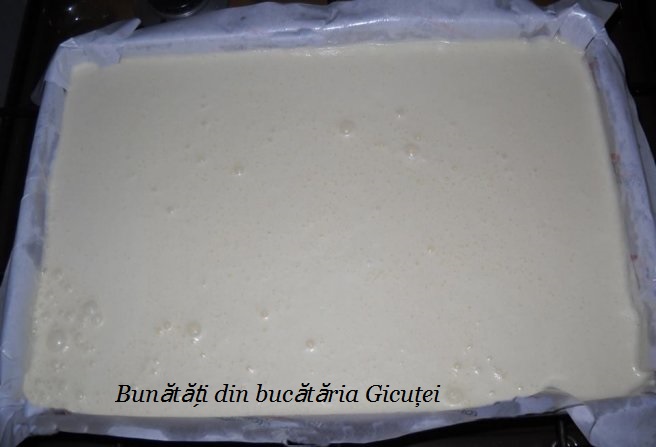 Turnam amestecul intr-o tava (25×35 cm) tapetata cu hartie de copt.