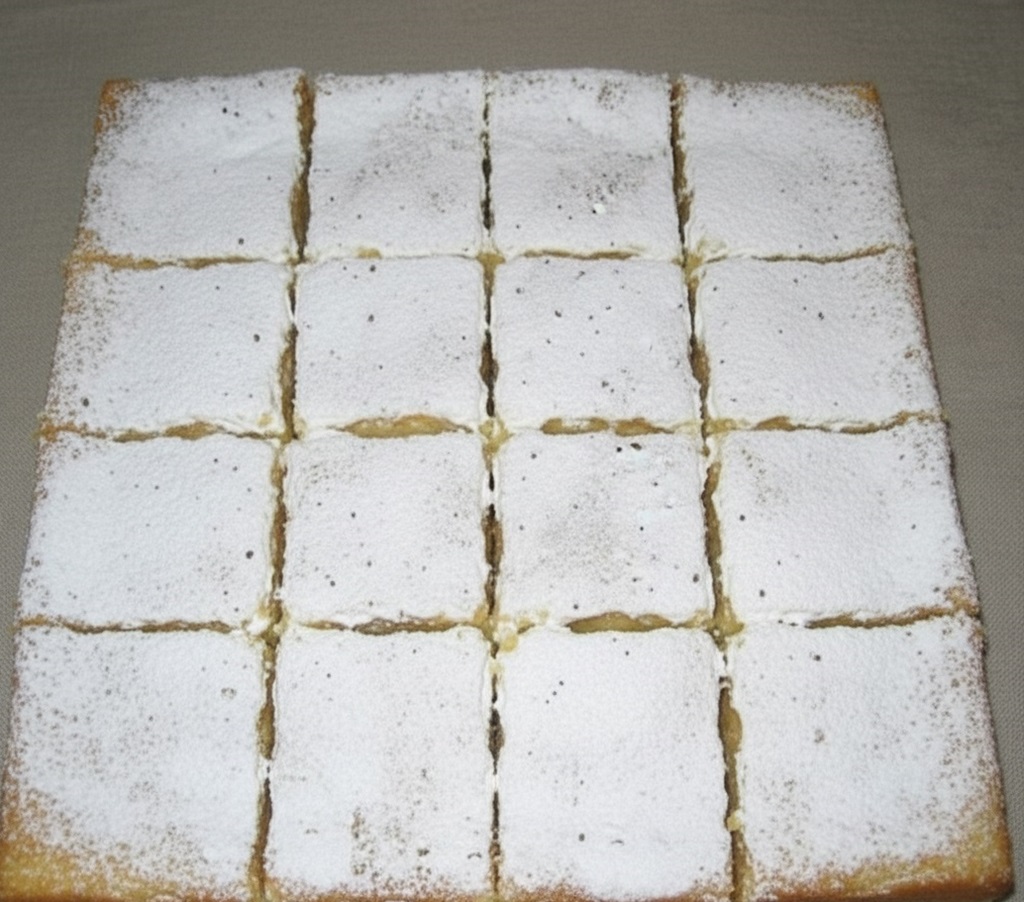 Cand prajitura este coapta o lasam sa se raceasca in tava, apoi o dam la frigider pentru cateva ore sau cel mai bine peste noapte. Scoatem prajitura din tava, cu hartie cu tot, si o punem pe un platou/tava, apoi tragem usor hartia de sub ea. Inainte de servire pudram prajitura cu zahar, apoi o portionam. Bu-na-ta-te!