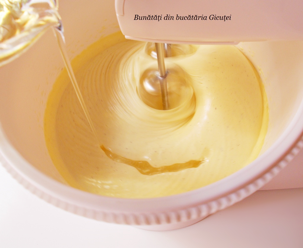 Spargem ouale in vasul mixerului sau intr-un bol, presaram un praf bun de sare peste ele si le mixam cateva secunde. Incorporam in doua reprize zaharul si zaharul vanilat si mixam bine pana se dizolva. Turnam uleiul in fir subtire in timp ce mixam, adaugam treptat iaurtul si praful de copt stins in zeama de lamaie.