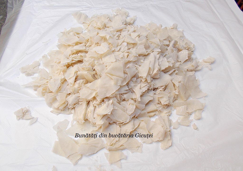 Rupem foile de placinta (pastram una pe care o vom asterne pe fundul tavii) in bucati potrivite.