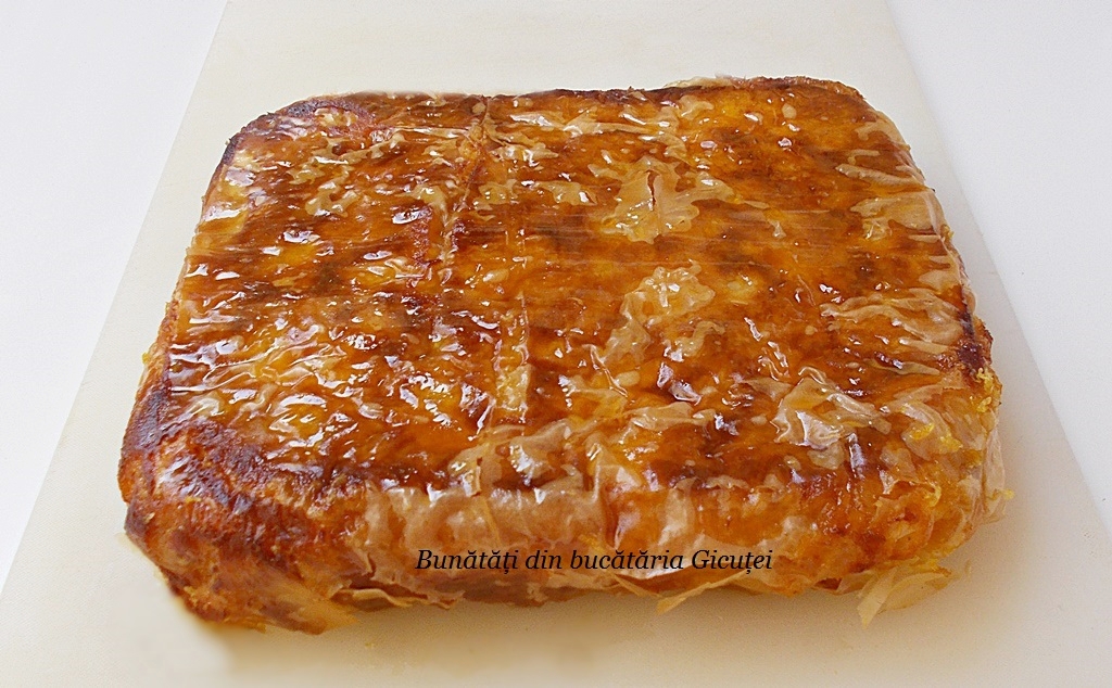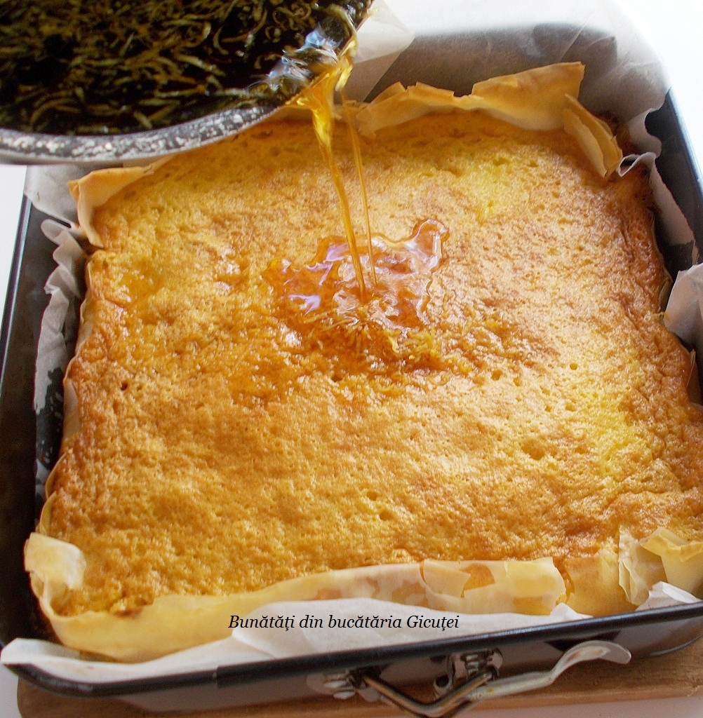 Scoatem prajitura coapta din cuptor si turnam siropul pe toata suprafata ei. Cand se racoreste o rasturnam pe o tava. Portionam prajitura cand este rece si o servim cu mare pofta, ca-i tare buna.. Cam asta-i tot, simplu de facut, nu-i asa?