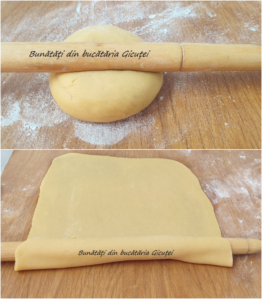 Spargem ouale intr-un bol, punem peste ele zaharul, zaharul vanilat si sarea si le mixam bine pana acestea se dizolva. Turnam treptat uleiul si laptele, apoi amoniul stins in otet. Incepem sa adaugam faina cernuta si sa amestecam. La inceput amestecam cu lingura, apoi cu mana. Cand se formeaza aluatul il rasturnat pe blatul de lucru infainat si il framantat pana nu se mai lipeste de maini. In functie de calitatea/umiditatea fainii putem reduce sau mari cantitatea pe care am mentionat-o la ingrediene. Trebuie sa obtinem un aluat nici prea moale, nici tare. Cand aluatul este gata il punem din nou in bol, il acoperim cu folie alimentara si il lasam la odihnit jumatate de ora la temperatura bucatariei. Dupa acest timp impartim aluatul in 4 parti egale. Pe masa usor infainata modelam fiecare bucata de aluat in forma de bila. Lasam o bila de aluat, iar pe celelalte le punem in bol si le acoperim cu folie alimentara. Incepem sa intidem prima bila de aluat pe masa usor infainata. Daca este nevoie pudrati cu faina si sucitorul ca sa nu se lipeasca aluatul de el. O intindem cat mai aproape de dimensiunea tavii. Cand este gata, o rulam pe sucitor, o asezam pe hartie de copt deruland-o, apoi o transferam cu totul pe fundul tavii. Indreptam marginile daca este cazul. Daca doriti puteti intepa aluatul din loc in loc cu furculita….eu nu l-am intepat de data aceasta 🙂 , dar la sfarsit prajitura a fost si gustoasa si aspectuasa. Introducem tava in cuptorul preincalzit la foc moderat(180°C) si coacem foaia aproximativ 5-7 minute sau pana incepe sa se rumeneasca usor pe margini. Stati cu ochii pe ea ca se arde numaidecat!….nu trebuie sa o rumenim prea tare, doar sa o uscam. Cand este gata, o transferam cu hartie cu tot pe un blat sau o alta suprafata plana. Trebuie sa umblam usor cu foile ca sunt foarte casante.