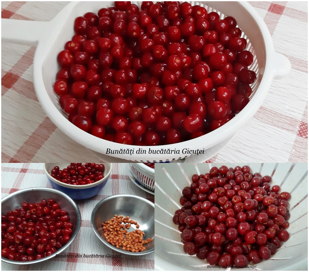 Pentru inceput ne ocupam de cirese: le spalam, indepartam coditele si le punem la scurs intr-o strecuratoare. Cand sunt scurse le scoatem samburii si le lasam iarasi in strecuratoare sa se scurga bine de zeama/suc. Din cand in cand scuturam strecuratoarea.