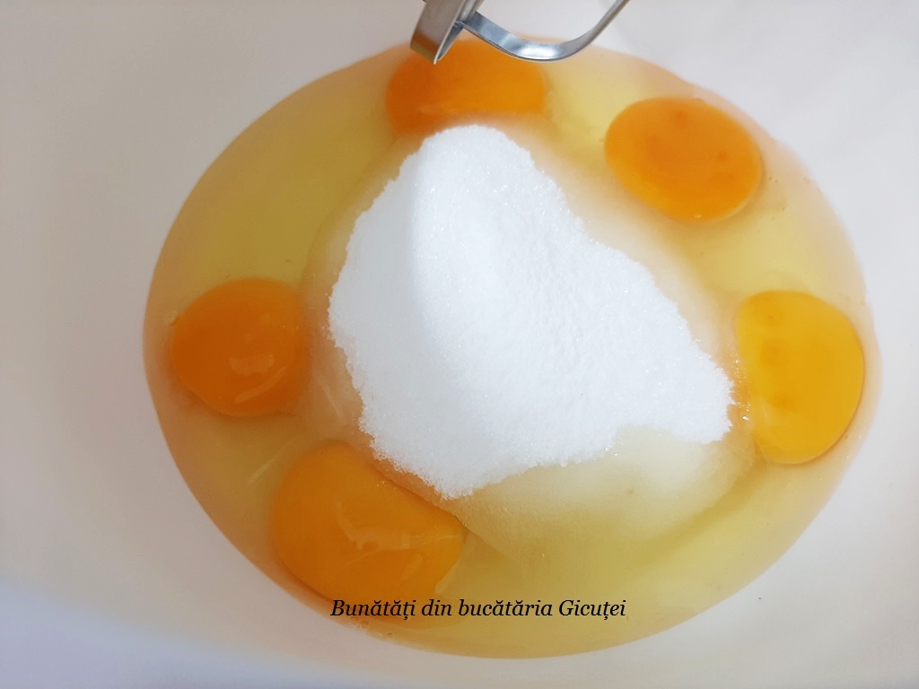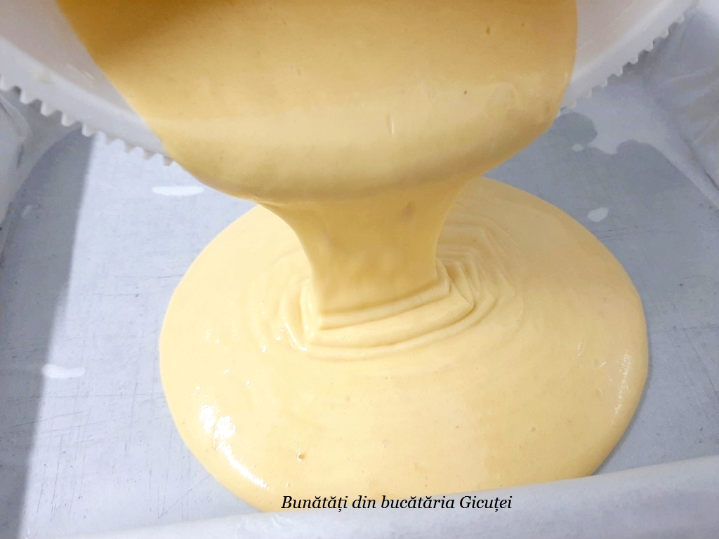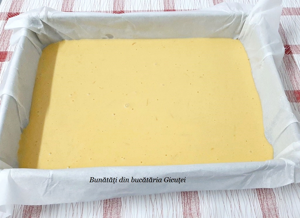 Pornim cuptorul la foc mediu(180°C) si asternem hartie de copt intr-o tava. Eu am folosit o tava cu dimensiunile de 25×35 cm si am udat-o inainte de a pune hartia ca sa o pot aseza mai bine.