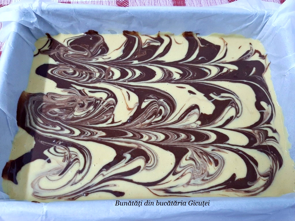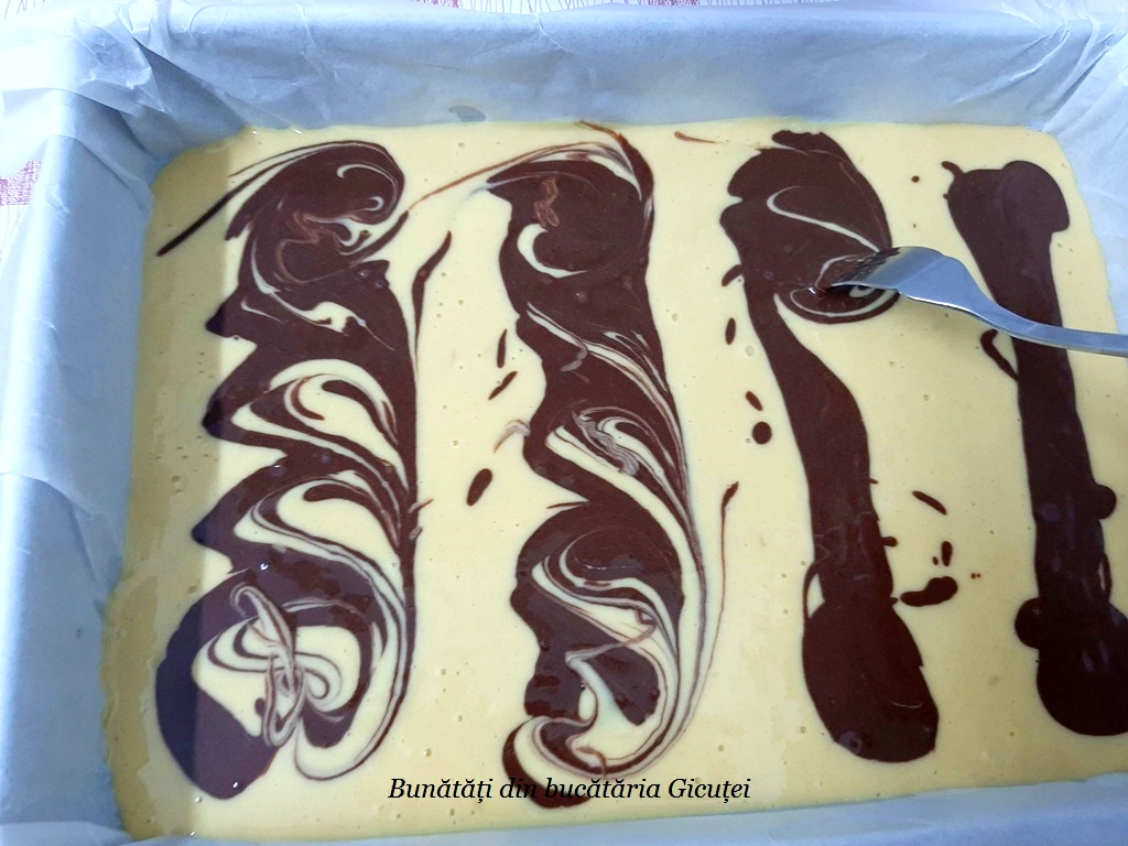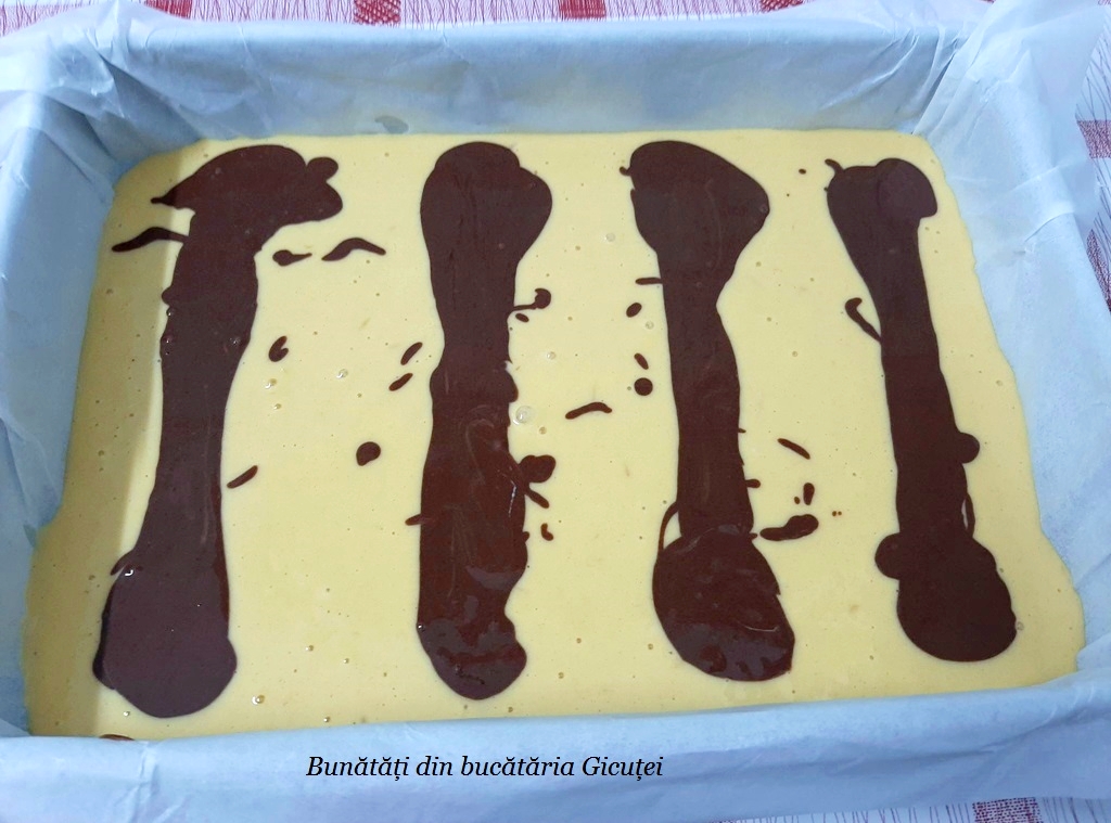 Masuram/cantarim ingredientele si cernem faina impreuna cu praful de copt. Spargem ouale in vasul mixerului sau alt bol si adaugam peste ele zaharul, zaharul vanilat si sarea. Mixam bine pana compozitia isi dubleaza volumul si se deschide la culoare. Zaharul trebuie sa se dizolve complet. Turnam uleiul in fir subtire in timp ce mixam, apoi adaugam iaurtul in 2-3 transe. Cu mixerul la viteza mica incorporam treptat faina, iar la final aromatizam cu razatura de lamaie. Punem compozitia in tava pregatita dinainte si oprim 5-6 linguri in vas. Amestecam cacaoa cu putina apa calda(1-2 linguri), o punem peste aluatul ramas si amestecam pana se omogenizeaza. Luam cu lingura din compozitia maro si trasam linii peste compozitia alba, apoi facem diferite forme cu furculita(vezi foto mai jos). Asezam fructele deaspura aluatului, apoi dam tava la cuptor pentru aproximativ 40-45 de minute sau pana prajitura trece testul scobitorii: dupa primele 40 de minute infigem o scobitoare in mijlocul prajiturii si daca iese curata, fara aluat prins de ea inseamna ca prajitura este coapta. Daca pe scobitoare raman urme de aluat, mai coacem prajitura 5-7 minute, apoi repetam testul. Cand este gata, scoatem tava din cuptor, lasam prajitura sa se racoreasca putin, apoi o scoatem cu hartie cu tot si o lasam la racit. O portionam, o asezam pe un platou si o servim impreuna cu persoanele dragi. Super-buna!