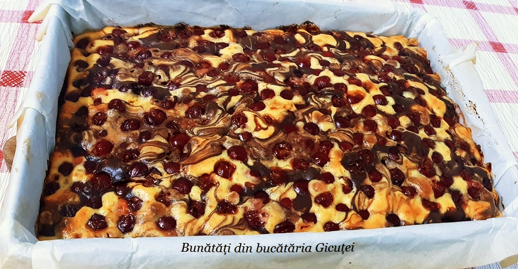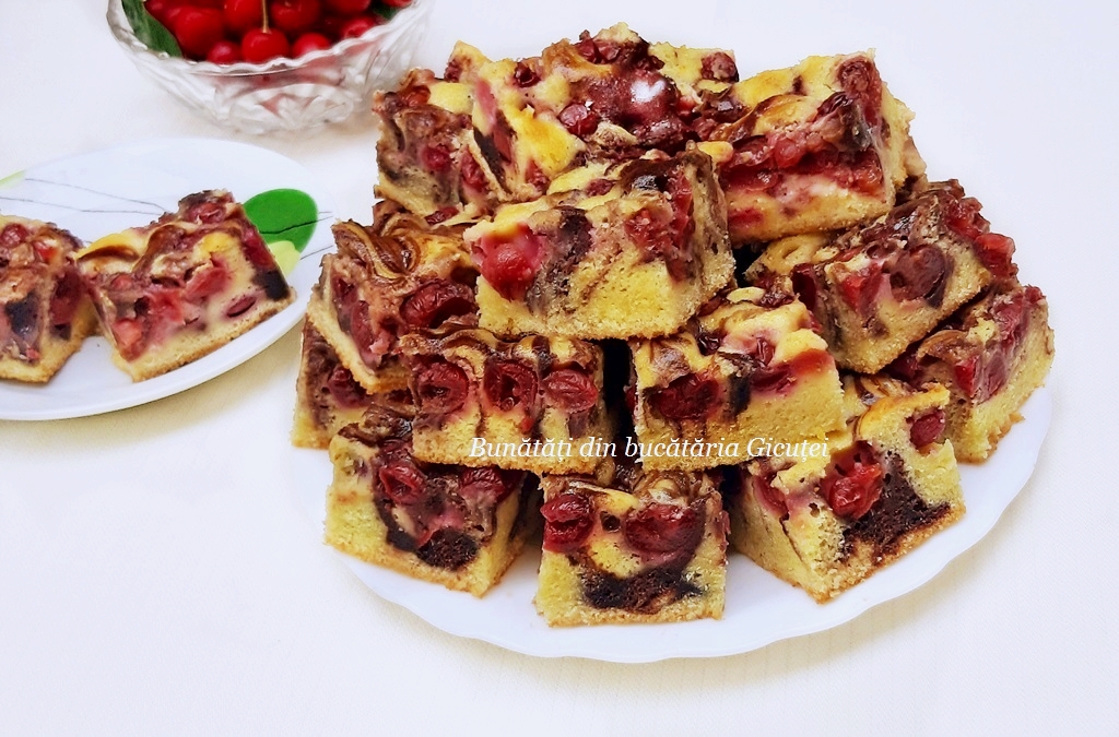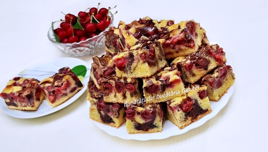 Saptamana trecuta am mers la tara si am cules de la vecinii mei dragi si harnici, Cecilia si Georgica, mai multe cirese. Au fost mai micute, dar dulci si aromate. Anul acesta s-au facut muuulte, aproape ca se rupeau crengile cu ele, mi-a parut rau ca nu am facut o poza cu ciresii. O parte din ele le-am folosit la aceasta prajitura delicioasa pe care o recomand cu drag. Este o prajitura aromata cu o textura usor umeda si in acelasi timp pufoasa.