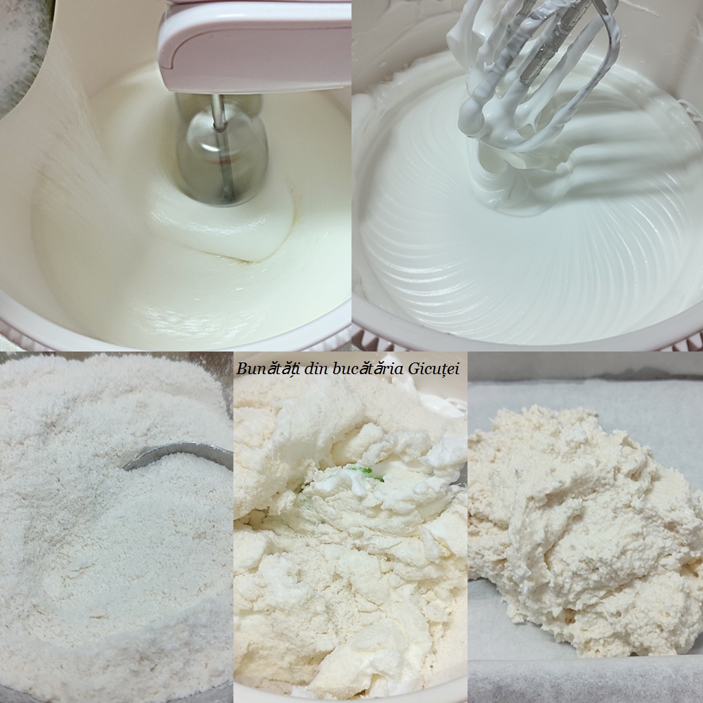 Punem albusurile in vasul mixerului sau in alt bol, adaugam sarea peste ele si le mixam spuma. Galbenusurile le vom folosi la crema. Adaugam in 2-3 reprize zaharul si mixam bine de fiecare data pana acesta se dizolva complet si se formeaza o bezea. La final incorporam faina amestecata cu nuca de cocos amestecand usor cu o spatula de jos in sus. Intindem compozitia intr-o tava(25x35cm) tapetata cu hartie de copt si o lasam deoparte pana pregatim blatul de cacao.