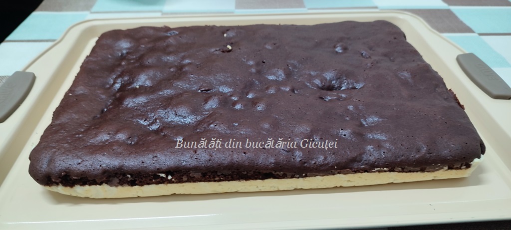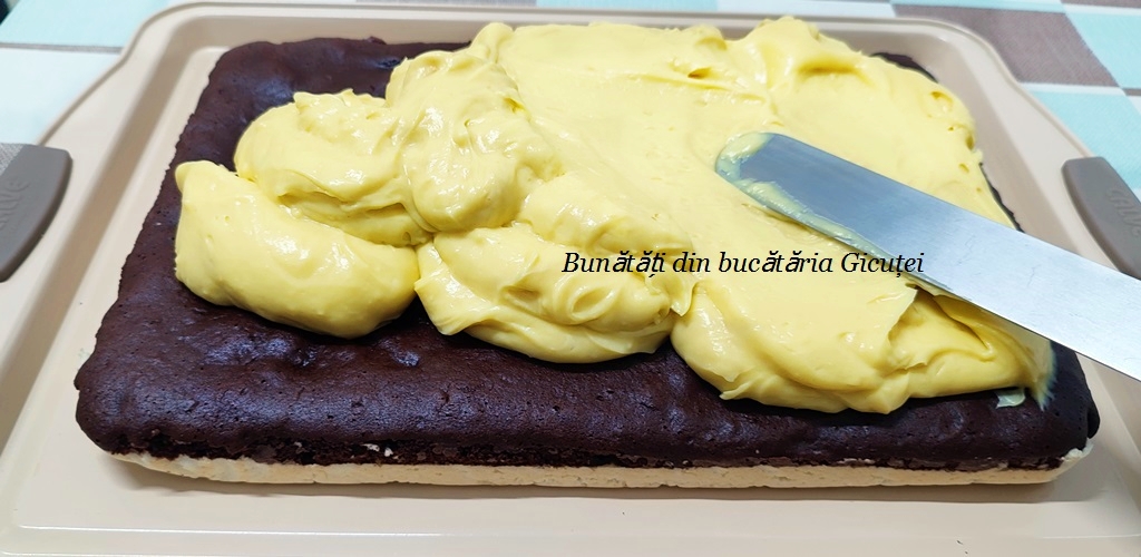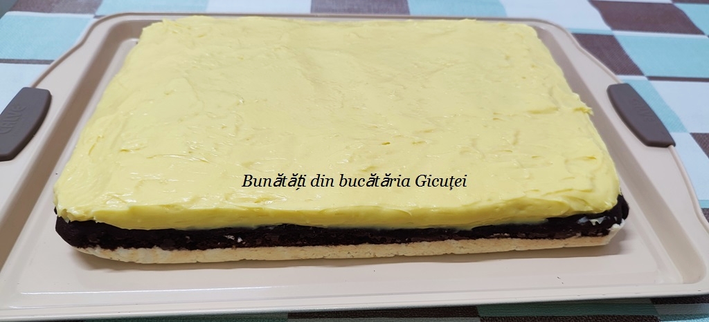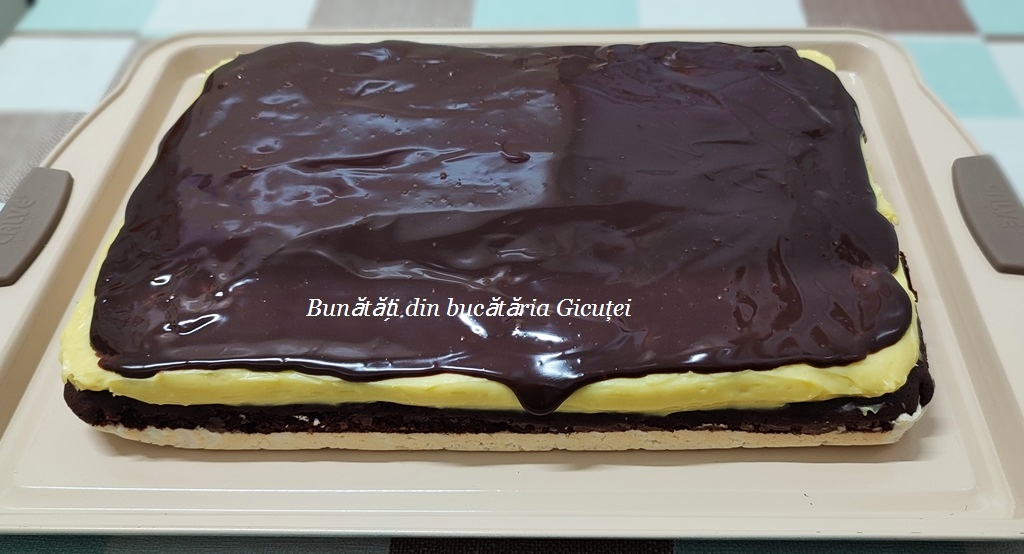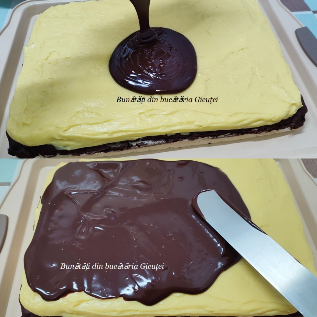 Cand este rece, o intindem peste blatul racit si dam prajitura la frigider pana pregatim glazura.