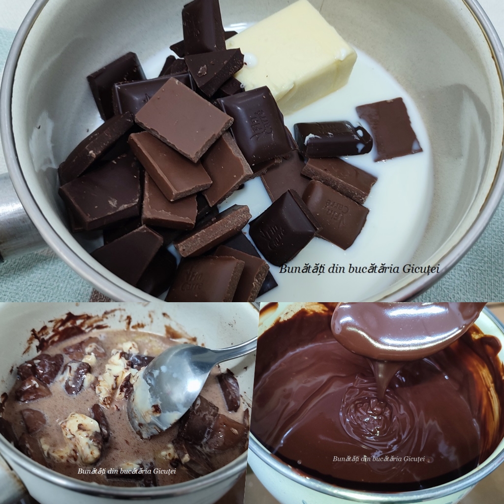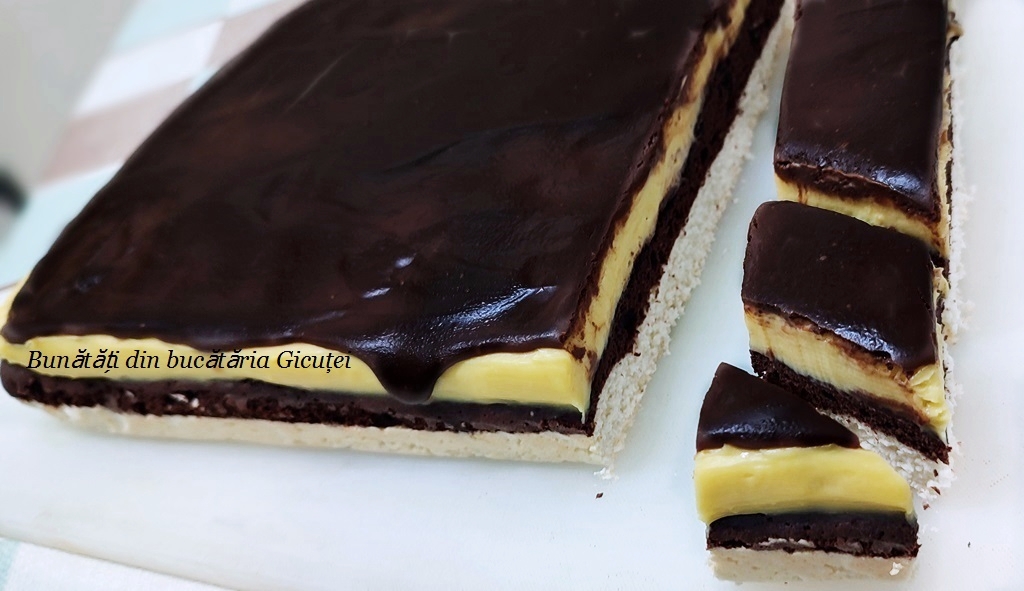 Punem intr-o craticioara ciocolata rupta patratele, untul si cele 5 linguri cu lapte. Asezam craticioara pe foc mic si amestecam continuu pana se topesc ciocolata si untul. Cand este gata o lasam sa se raceasca(sa devina usor calduta) , apoi o turnam deasupra cremei si o intindem rapid cu o spatula de patiserie sau un cutit cu lama lunga. Dam din nou tava la frigider ca sa se intareasca ciocolata, apoi putem portiona prajitura. O vom portionam cu un cutit lung si ascutit pe care il stergem la fiecare taietura. Un deliciu si aceasta prajitura!