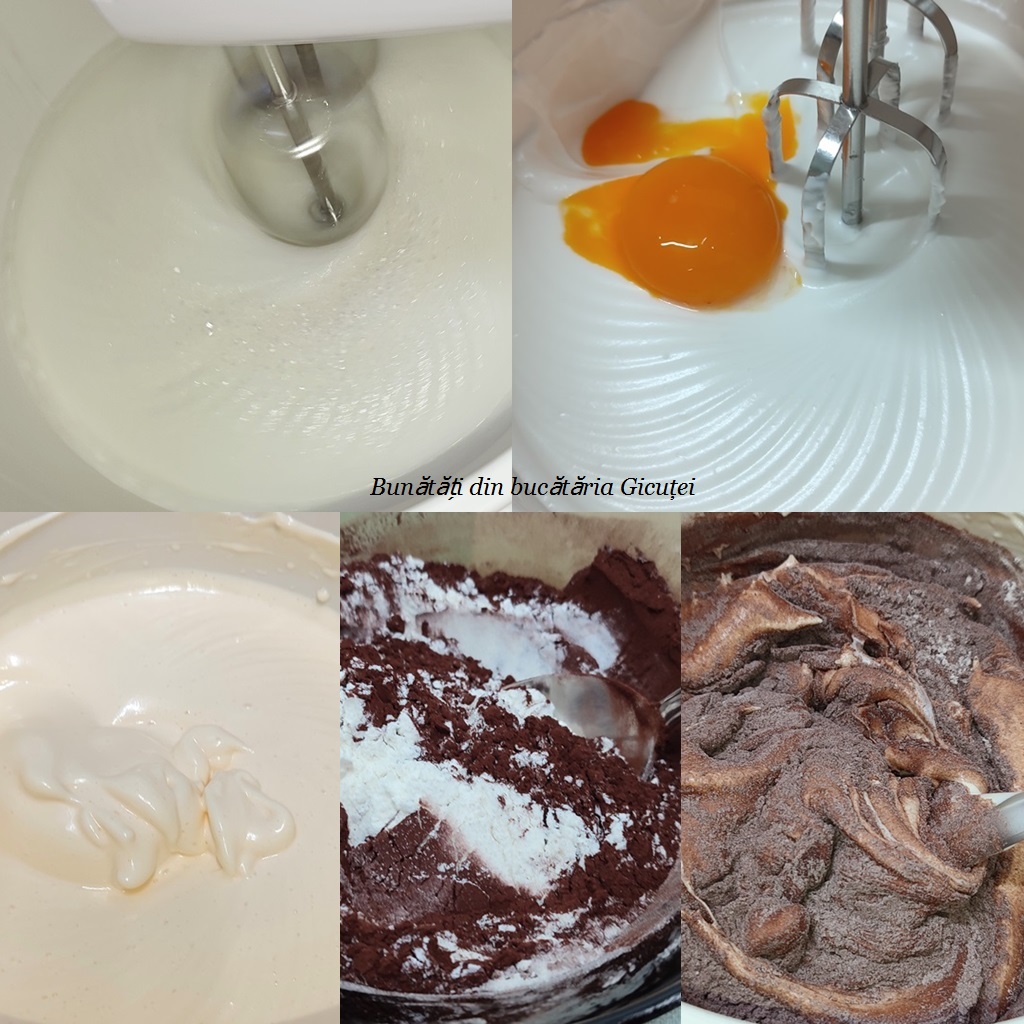 Mixam spuma albusurile cu sarea, apoi adaugam zaharul si mixam pana acesta se dizlova. Punem pe rand galbenusurile si mixam dupa fiecare. Cu ajutorul unei spatule de bucatarie incorporam faina amestecata si cernuta cu cacaoa si praful de copt.