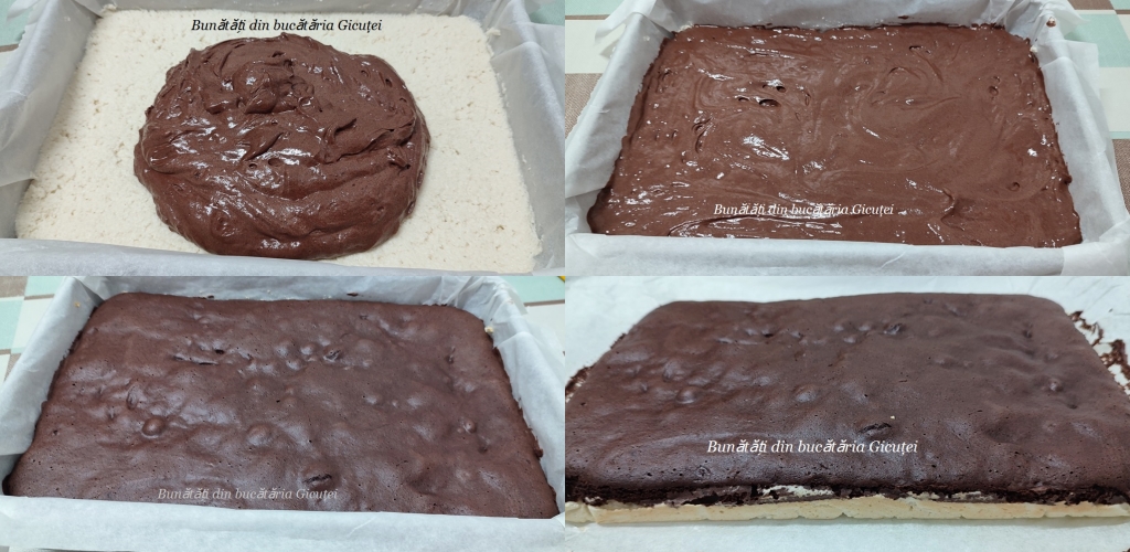Intindem compozitia de cacao peste compozitia de cocos, apoi dam tava la cuptorul preincalzit(180°C) pentru aproximativ 25 de minute. Dupa primele 20 de minute facem testul scobitorii: infigem o scobitoare in mijlocul blatului si daca iese curata, fara aluat prins de ea, inseamna ca blatul este copt. Daca pe scobitoare se prinde aluat mai lasam la copt 5-7 minute si repetam testul.