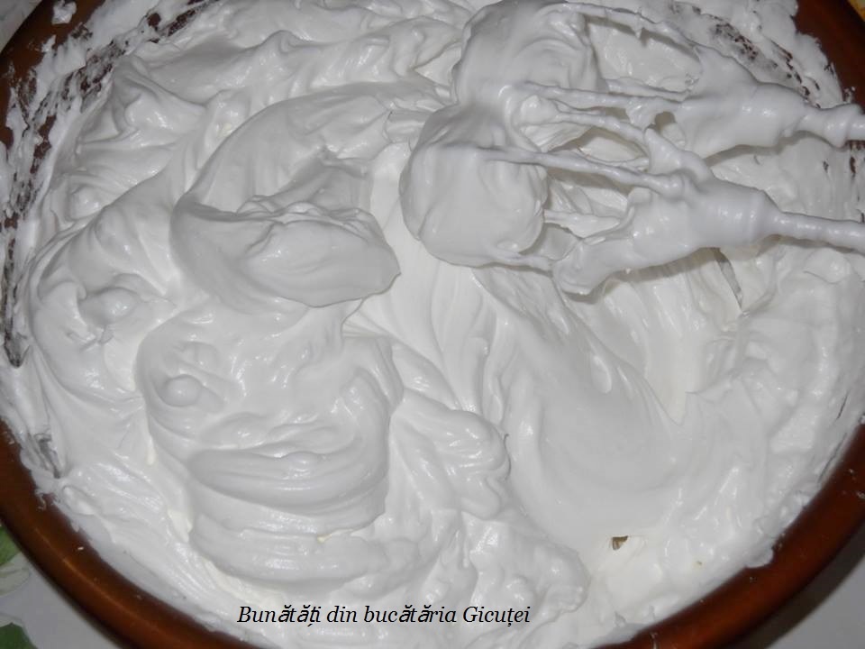 Măsurăm și cântărim toate ingredientele pentru a le avea la îndemână. Punem albușurile, care trebuie să fie la temperatura camerei, într-un bol sau în vasul mixerului. Adăugăm sarea peste ele și mixăm până când obținem o spumă fermă. Adăugăm apoi, în două sau trei reprize, zahărul și zahărul vanilat, mixând bine de fiecare dată până când zahărul se dizolvă complet și obținem o bezea tare și lucioasă.