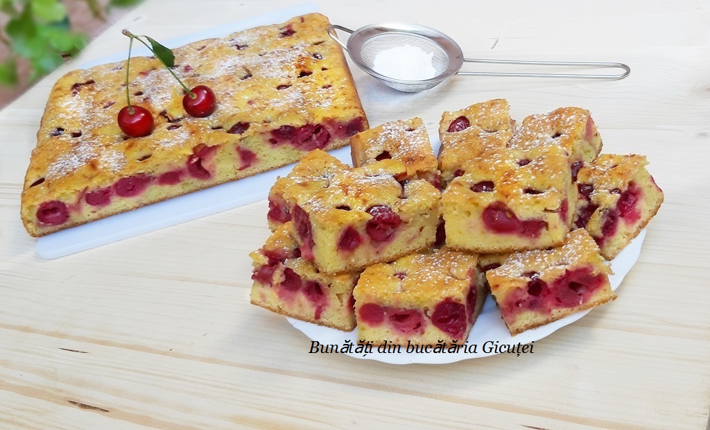 Turnam 2/3 din compozitie intr-o tava (24×24 cm, merge si una putin mai mare), apoi nivelam. In restul compozitiei adaugam cacao si cele doua linguri de lapte. Omogenizam cu o spatula. Turnam compozitia de cacao peste compozitia alba din tava si o nivelam si pe aceasta. Asezam deasupra visinile si dam tava la cuptorul preincalzit(foc mediu 170-180°C) pentru aproximativ 35-40 de minute sau pana blatul trece testul scobitorii: dupa primele 35 de minute infigem o scobitoare in mijlocul blatului si daca iese curata, fara aluat prins de ea inseamna ca este coapt. Daca pe scobitoare raman urme de aluat mai lasam blatul in cuptor si dupa cca 5 minute repetam testul.