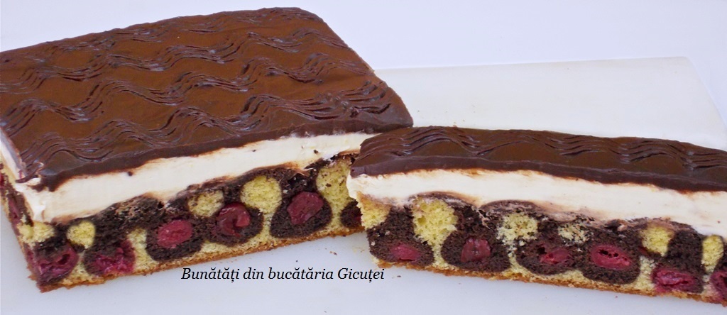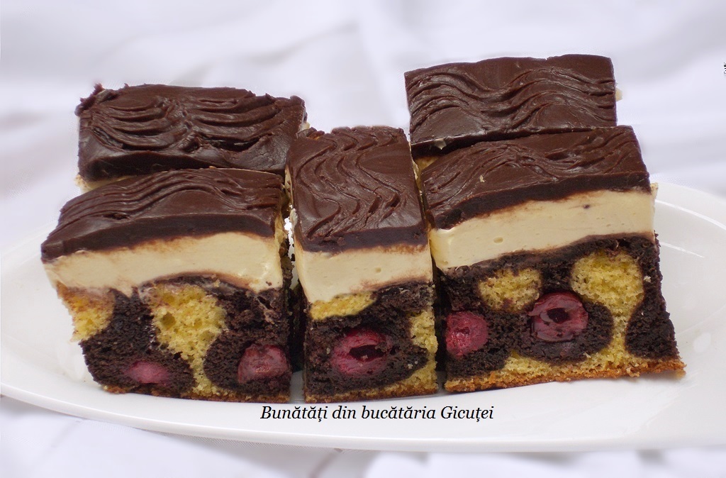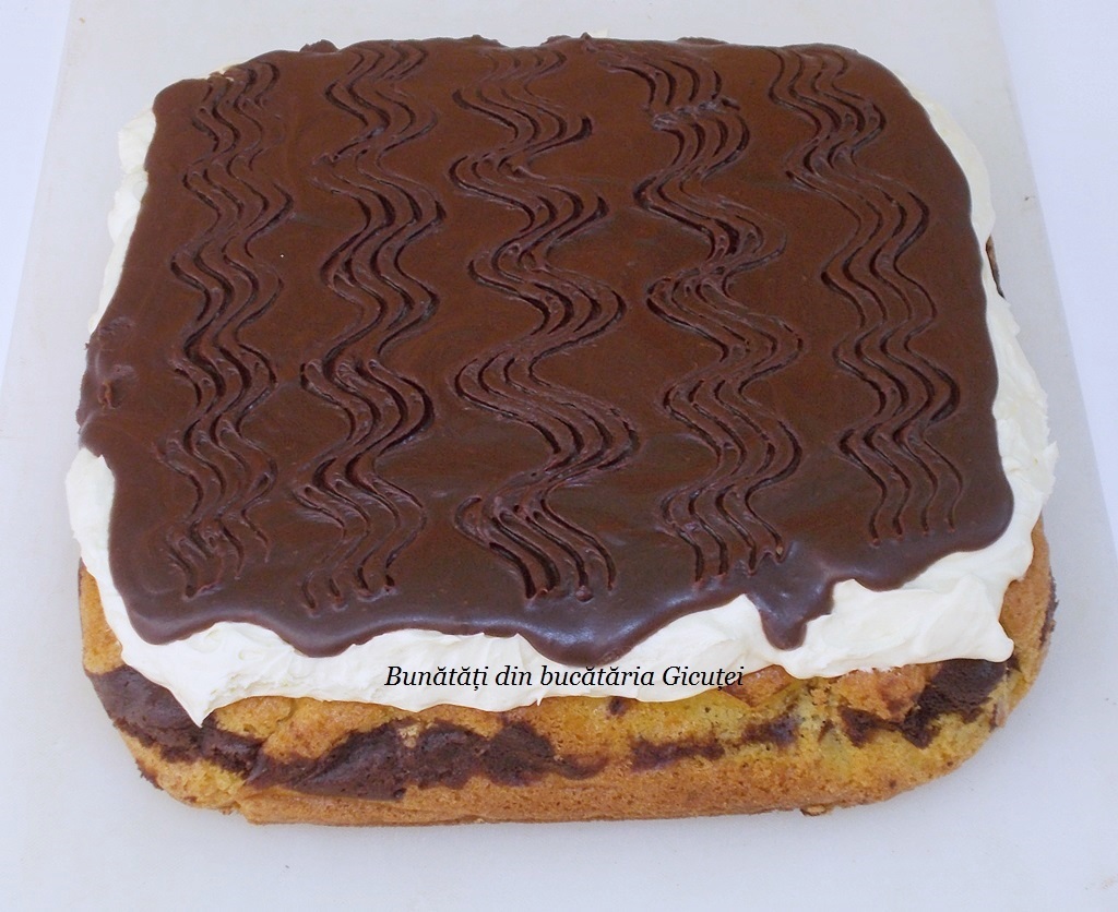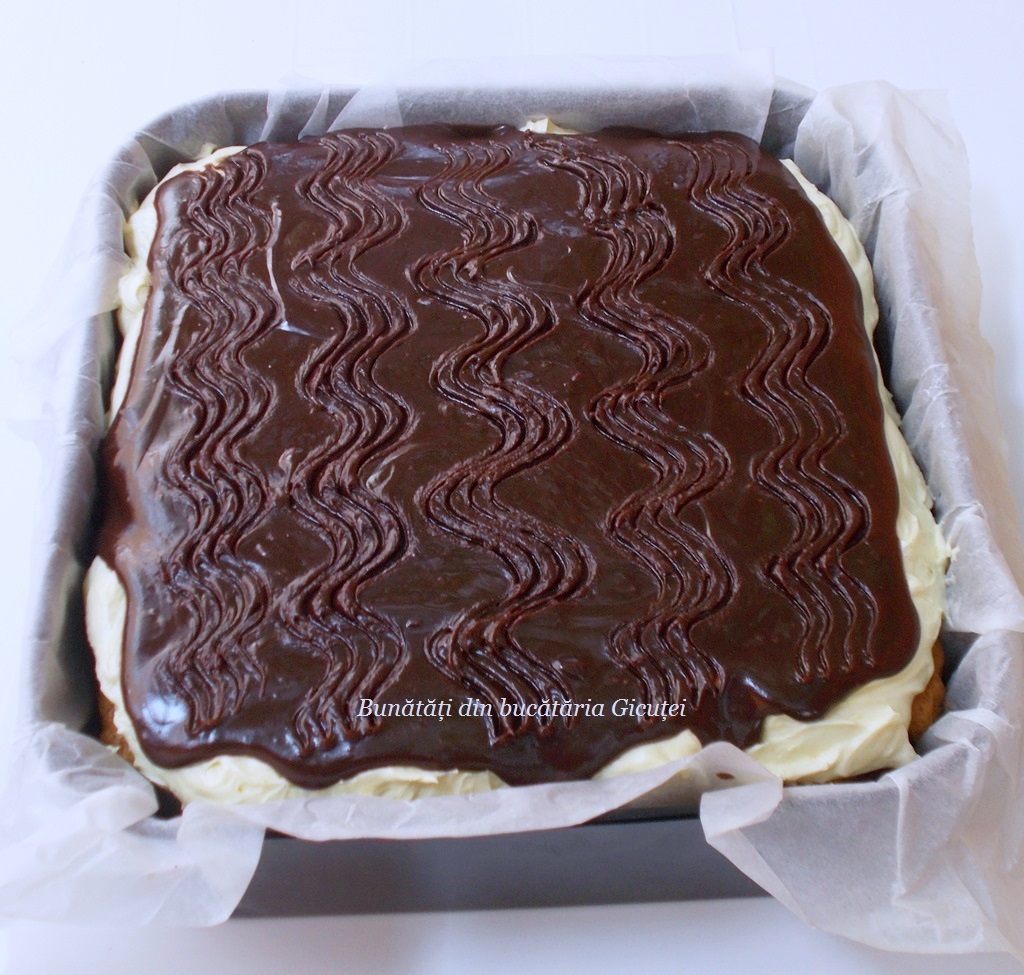Punem blatul cu hartie cu tot in tava in care l-am copt. Deasupra blatului intindem uniform crema racita. Peste crema turnam glazura usor calduta si nivelam rapid cu lama unui cutit. Dam prajitura la frigider pana se intareste putin glazura, apoi cu o furculita trasam valuri. Dupa cel putin 2 ore de stat la rece scoatem prajitura din tava. Indepartam/indreptam marginile prajiturii, apoi o taiem in forma de dreptunghiuri cu un cutit pe care il trecem de fiecare data prin apa fiebinte si il stegem. Este un deliciu!