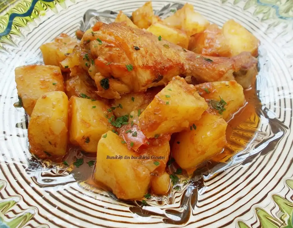 Asezam pulpele deasupra cartofilor, turnam o cana cu apa ( doar cat sa acopere cartofii) si dam cratita la cuptor la foc potivit.