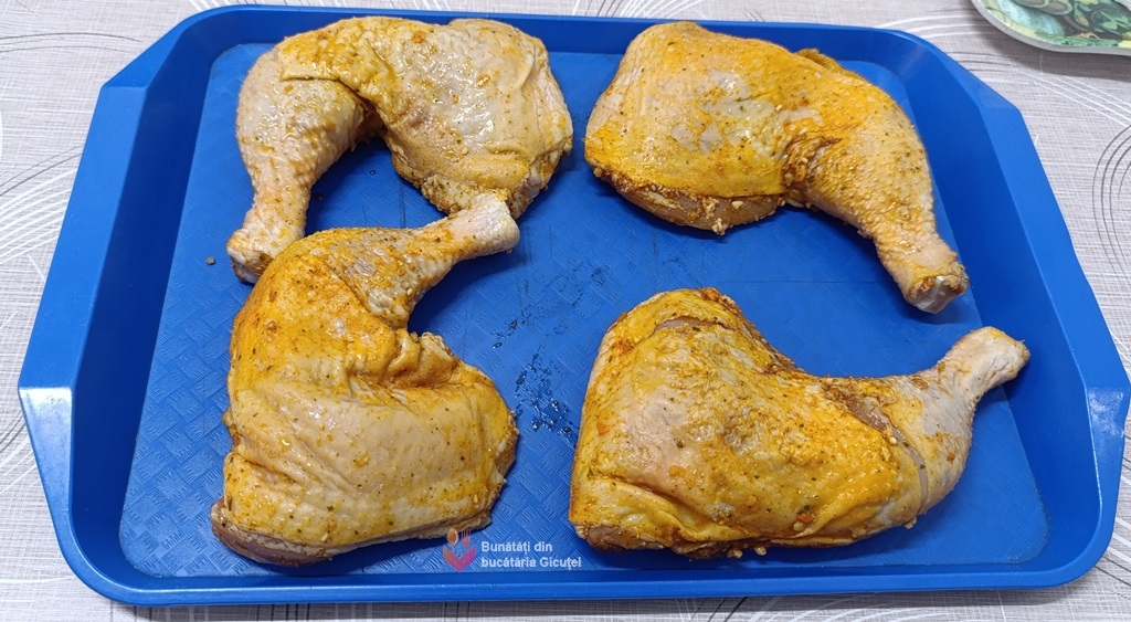 Pentru aceasta reteta vom avea nevoie de o punga termorezistenta(punga magica) care se gaseste in orice supermarket. Ca si condimente eu le-am folosit pe cele clasice, dar se pot adauga condimentele care va plac. Eu am avut 4 pulpe de pui cu spate care au cantarit aproximativ 1 kg.