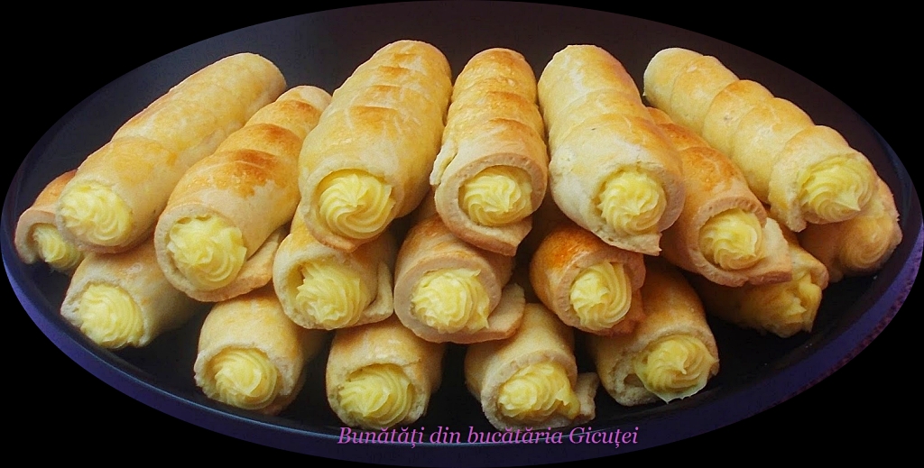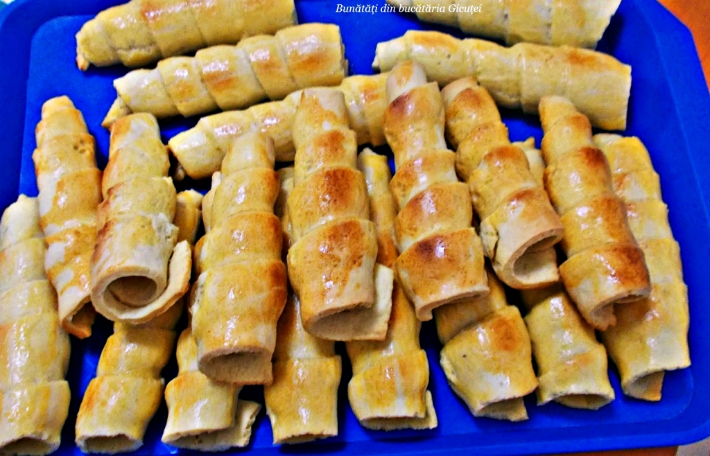 Dupa acest timp, il impartim in patru bucati egale si intindem fiecare parte intr-o foaie subtire. Taiem fasii de aproximativ 2 cm latime pe care le rulam pe forme metalice. Le asezam intr-o tava tapetata cu hartie de copt si le ungem cu ou (optional). Dam tava la cuptorul preincalzit la foc mediu (180°C) pentru aproximativ 15-20 de minute sau pana rulourile se rumenesc putin. Cand sunt gata, scoatem tava din cuptor si cand rulourile se racoresc putin indepartam usor formele .