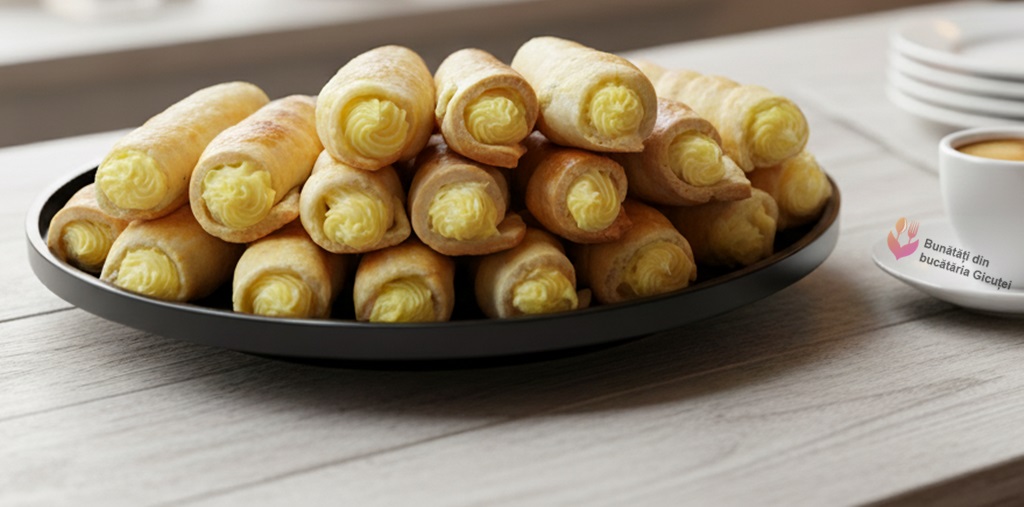 Cu ajutorul unui posh umplem rulourile cu crema. A doua zi rulourile se mai inmoaie si sun tocmai bune de servit. Delicioase!