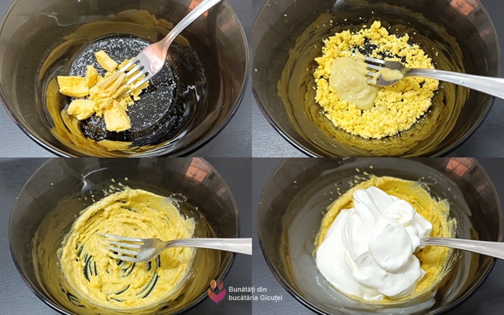 Intre timp facem dressingul: peste galbenus punem putina sare si il zdrobim bine cu furculita. Adaugam mustarul, omogenizam, apoi incorporam iaurtul si amestecam bine cu lingura.