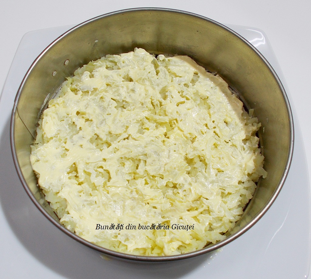 Pentru montare, vom avea nevoie de un platou mare și de inelul metalic al unei forme rotunde detașabile. Așezăm inelul pe platou și ungem baza, în interiorul acestuia, cu puțină maioneză. Primul strat este format din cartofii rași pe răzătoarea cu orificii mari, peste care întindem aproximativ o lingură de maioneză (eu am folosit un poș și apoi am nivelat cu lingura). Urmează peștele mărunțit, un strat subțire de maioneză și ceapa bine stoarsă de oțet. Întindem iarăși o lingură de maioneză, adăugăm albușul dat pe răzătoarea mare, presărăm puțină sare și piper, apoi punem din nou maioneză. Al patrulea strat va fi format din morcovii rași (oprim o lingură pentru decor), urmat de maioneză și apoi de sfecla roșie rasă și bine stoarsă în prealabil. Presărăm puțină sare, iar deasupra sfeclei ornăm cu gălbenușul dat pe răzătoarea mică și cu morcovul păstrat. Dăm salata la rece pentru 2-3 ore, după care scoatem cu grijă inelul detașabil și o putem servi. DE-LI-CIOA-SĂ!