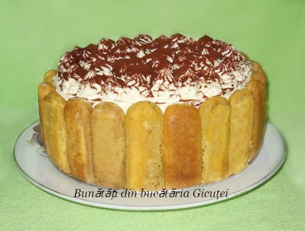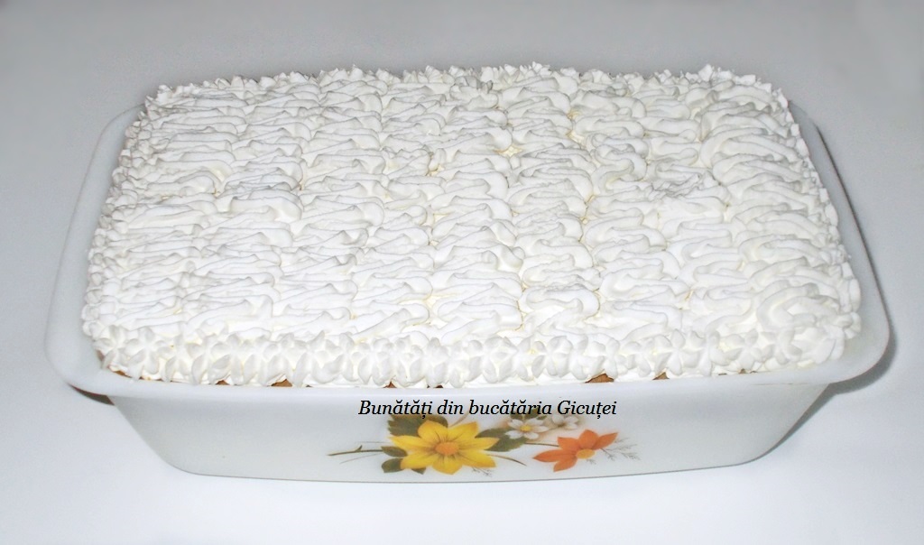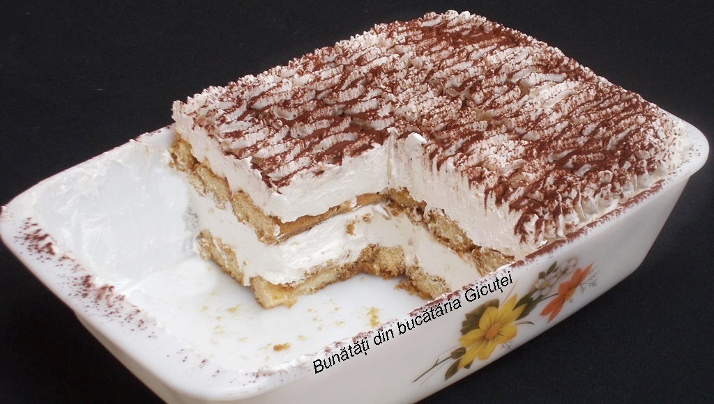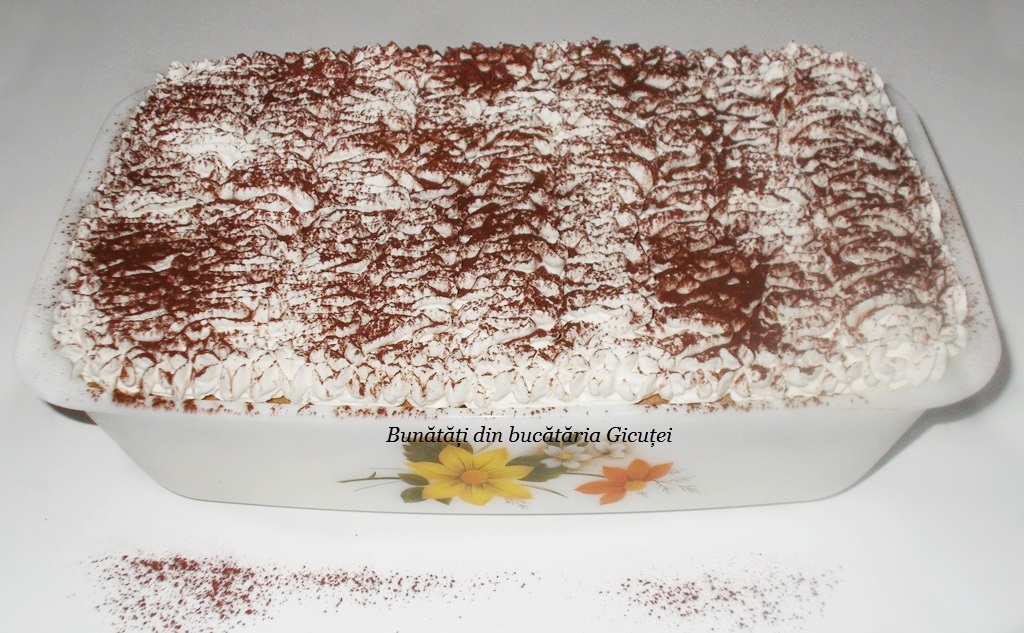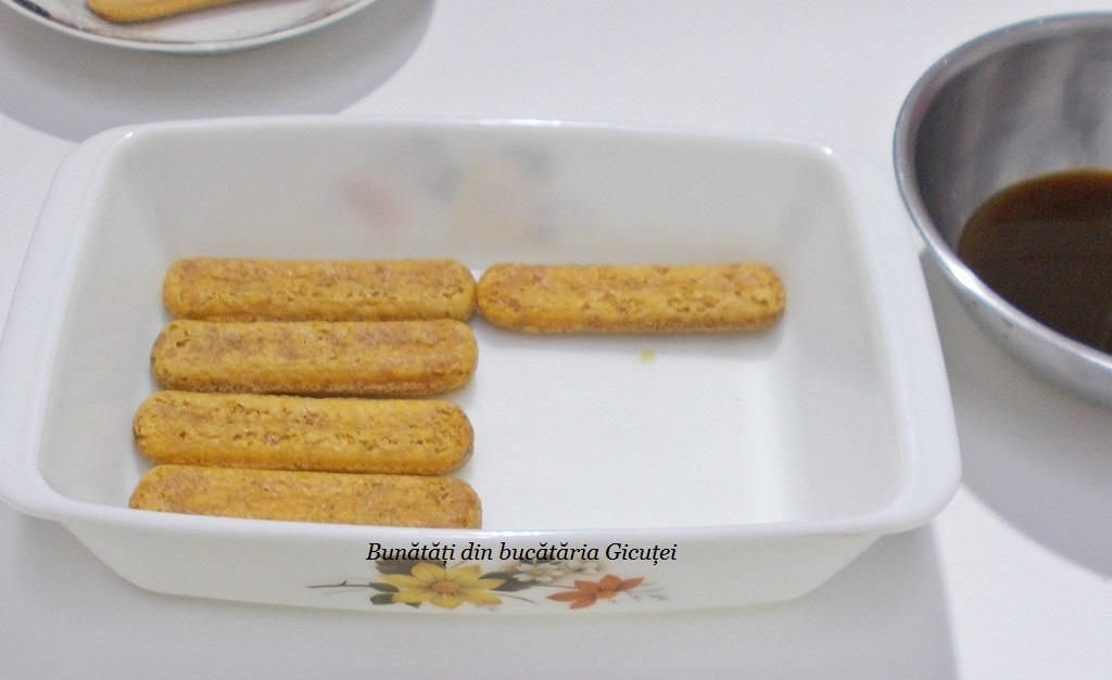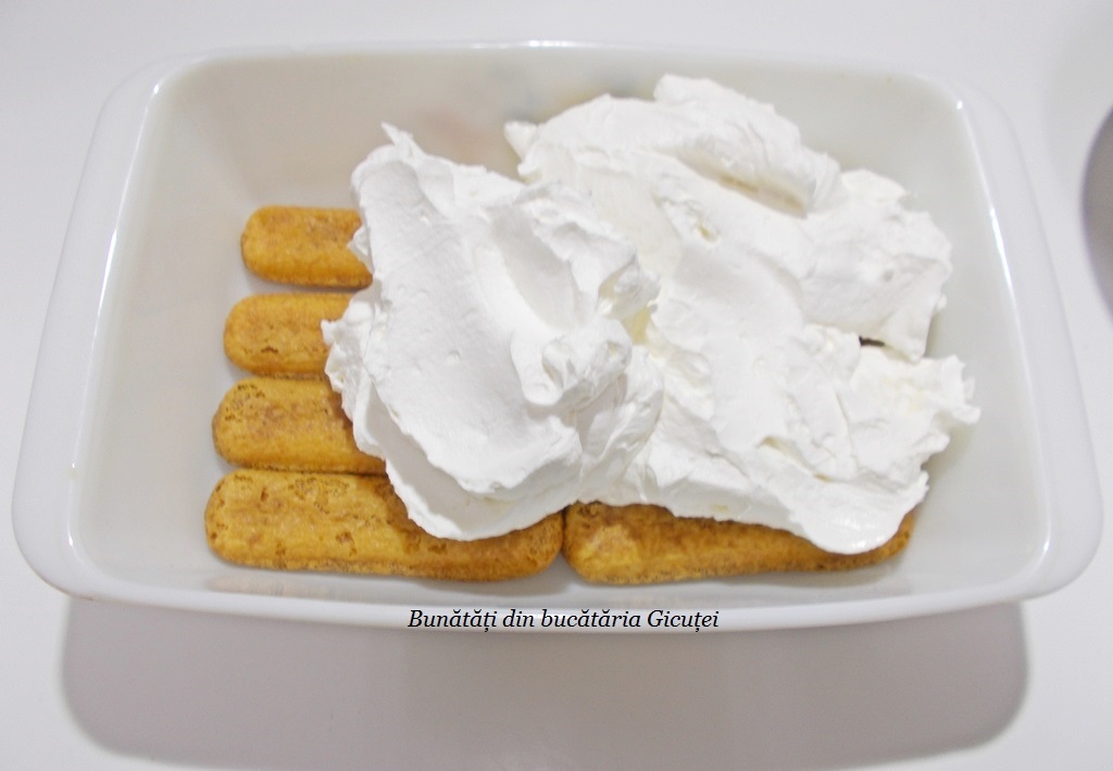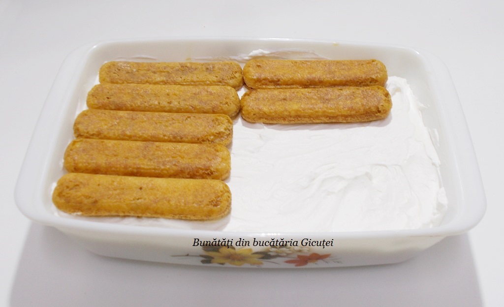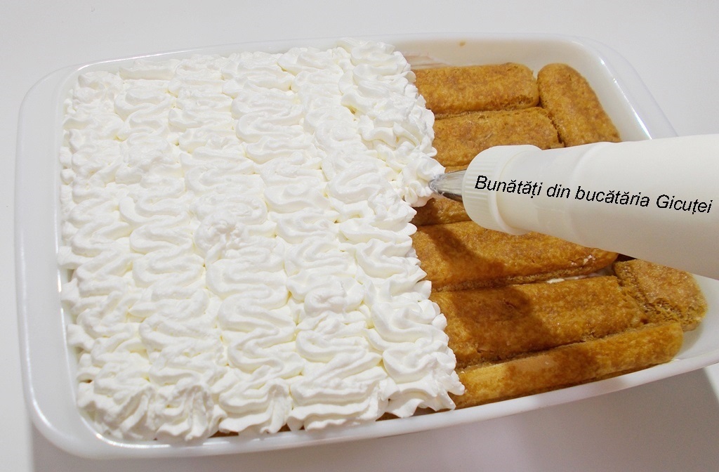 Intr-o tava sau un vas yena asezam un rand de piscoturi trecute rapid prin cafea. Eu am montat tiramisu intr-un vas cu dimensiunile 24x15x6 cm si mi-au intrat 200 g piscoturi. Daca aveti un vas putin mai mare puteti pune mai multe piscoturi…pana la 250 g. Peste piscoturi intindem jumatate din crema mascarpone si asezam din nou alt strat de piscoturi, la fel, trecute rapid prin cafea. Cu ajutorul unui pos/seringa de bucatarie spritam deasupra piscoturilor restul de crema. Cernem deasupra cacao si dam tava cu prajitura la frigider pentru cel putin 2 ore. Dupa acest timp prajitura se raceste, piscoturile se mai inmoaie si este numai buna de servit….un deliciu! Ati vazut cat de simplu se face, da?